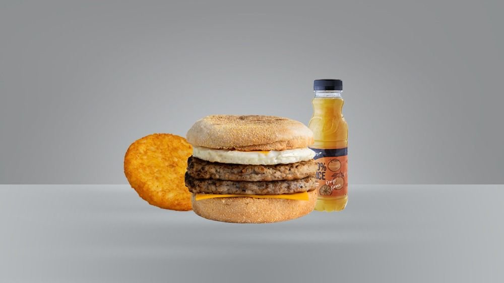 English muffin with double sausage, round egg, cheese and butter. Comes with Toast hashbrown and drink