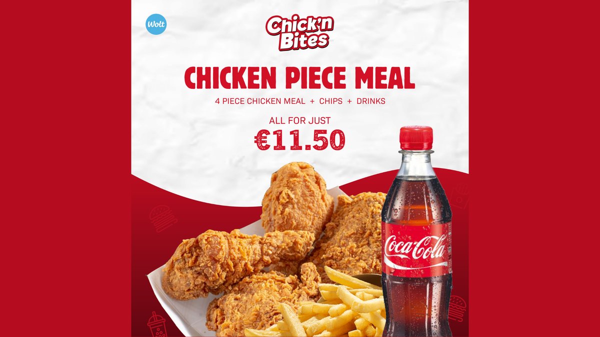 - 4 chicken fillet - 8 nuggets - 10 Chick'n pop's - 2 mozzarella sticks - 4 chips - 4 drinks