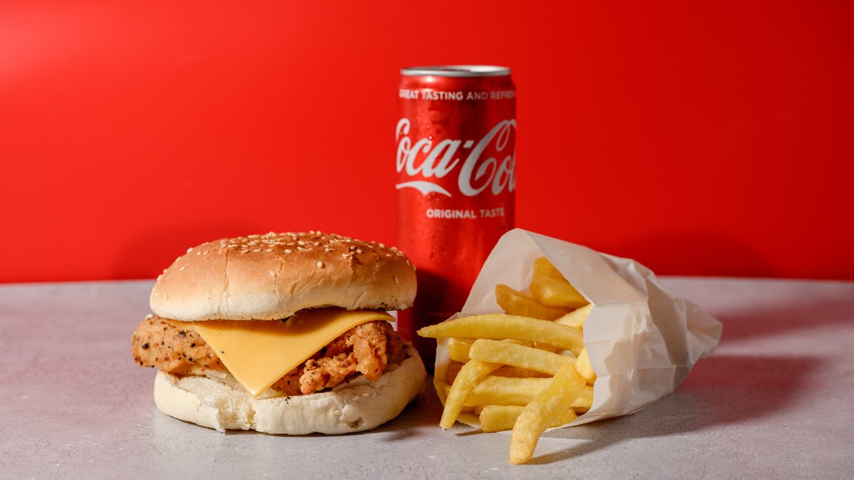 Chicken fillet with cheese, lettuce, onion, served with fries and drink of your choice