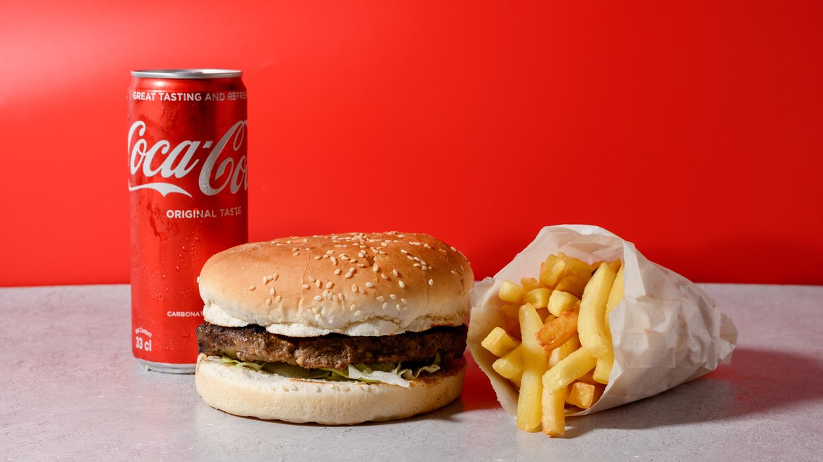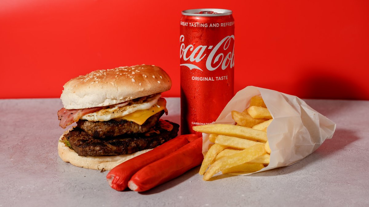 Double patty with cheese, lettuce, onion, bacon, egg, pork and frankfurter sausage, served with fries and drink