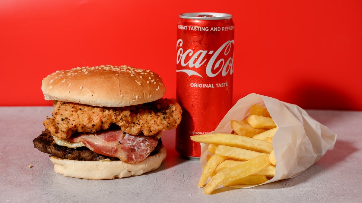 Double patty with cheese, bacon, egg, pork, and frankfurter sausage, served with fries and drink of your choice