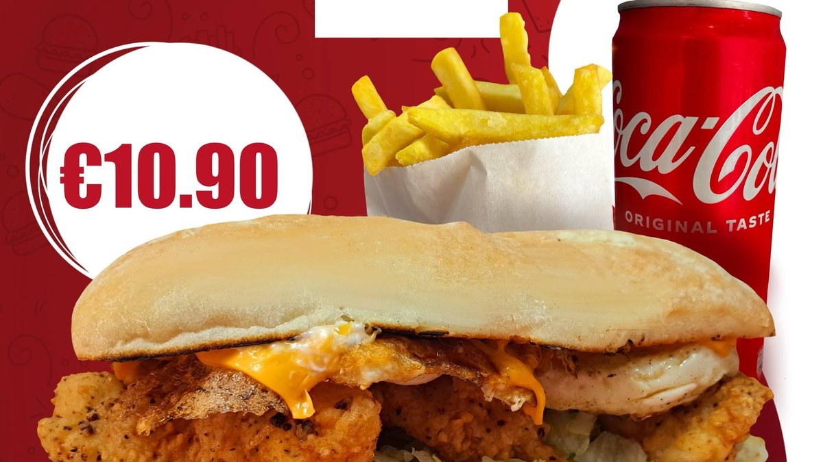 Chicken fillet, burger patty, 2 slices bacon, egg, 2 pork sausages, salad and fries, served with a drink of your choice
