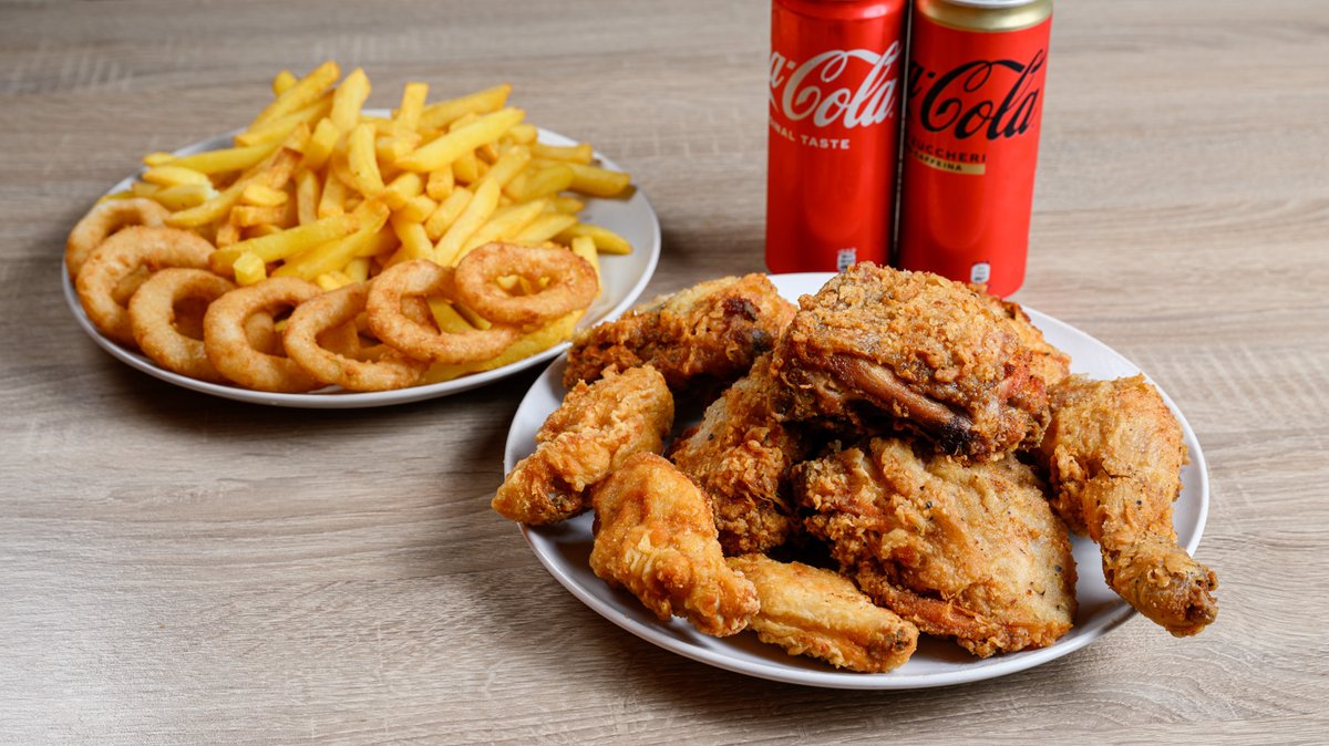 10 chicken pcs, 6 onion rings, 3 hot wings, 2 fries, 2 drinks