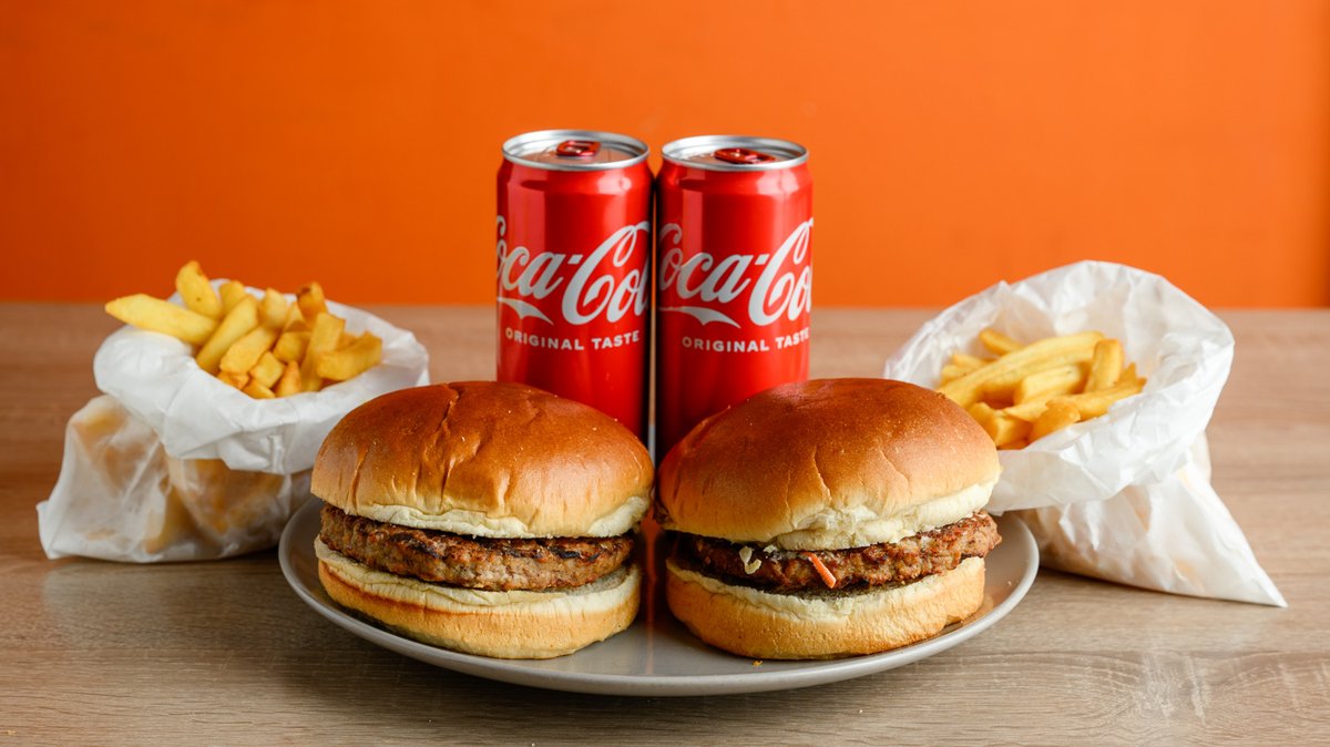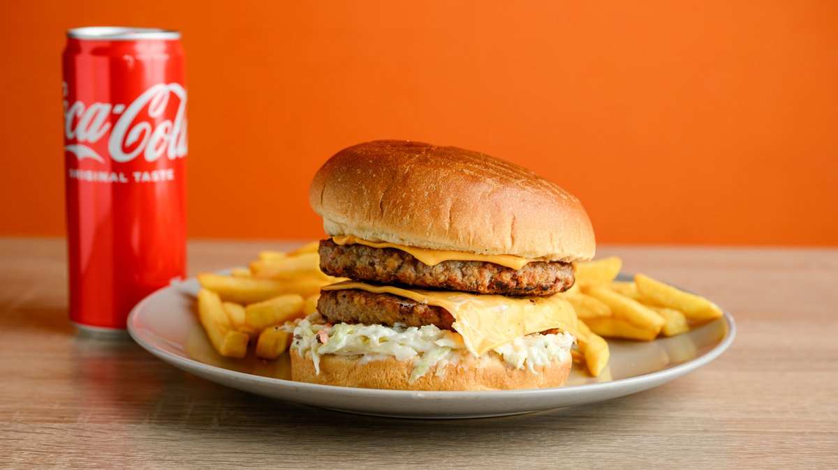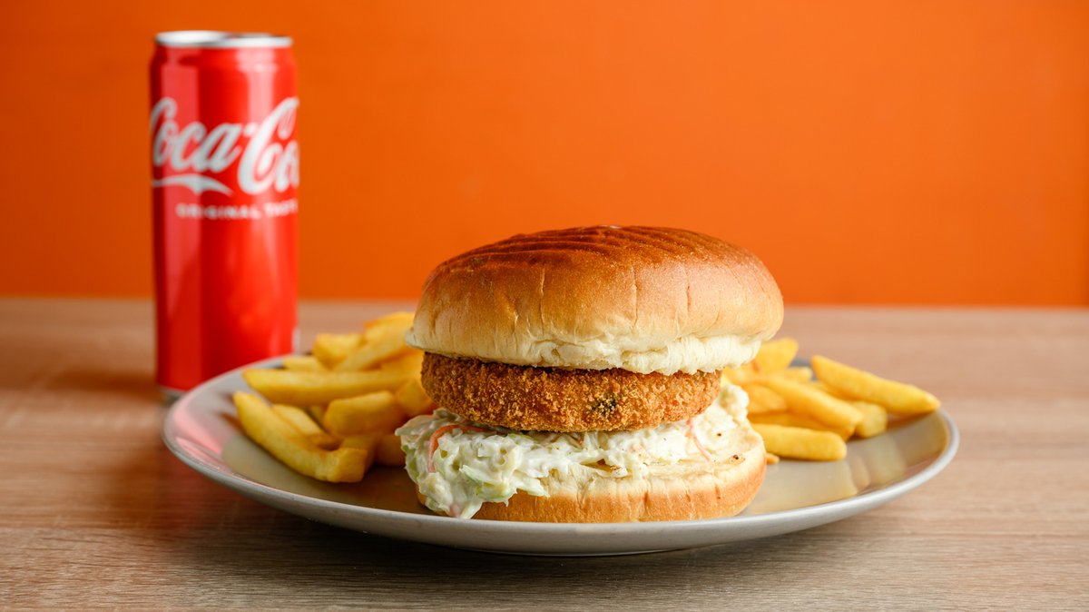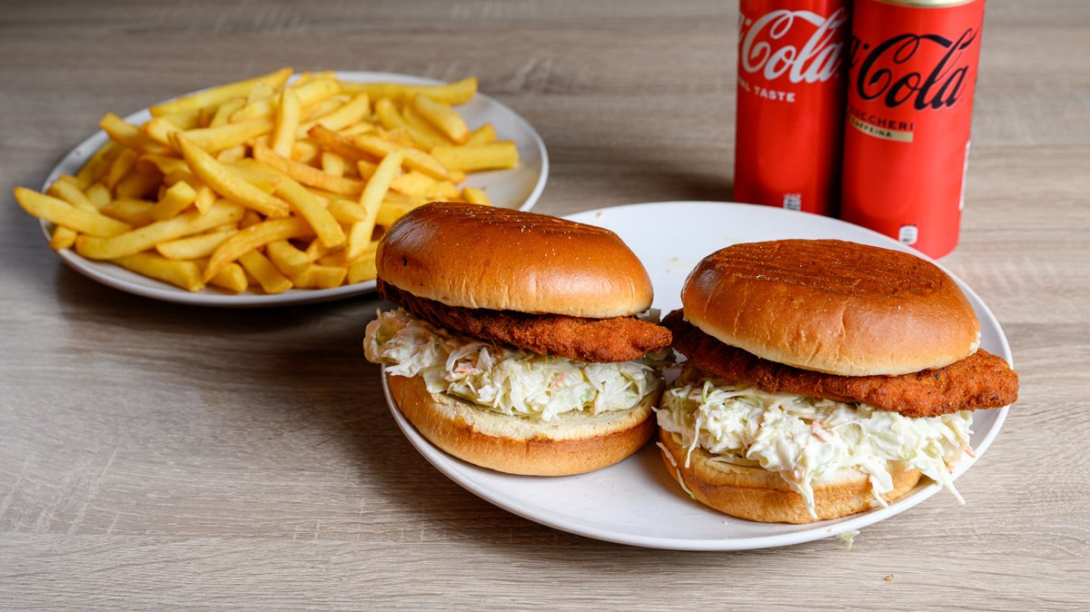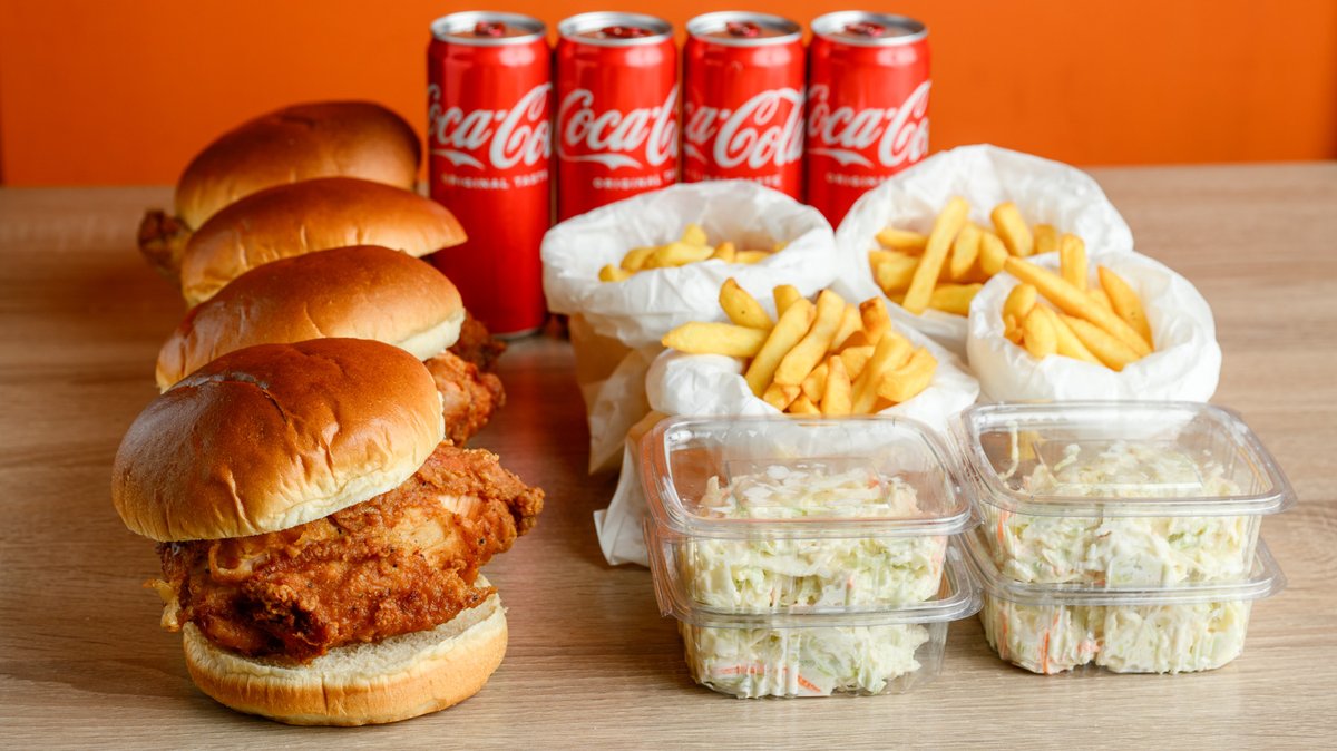 4 chicken fillet burgers, 4 fries, 4 drinks, 4 coleslaws