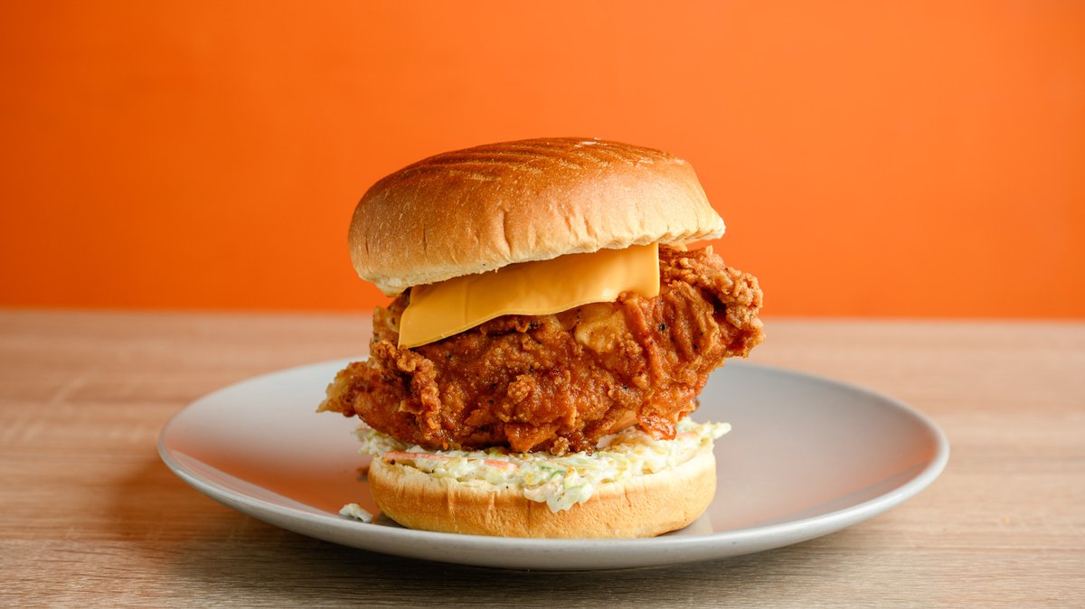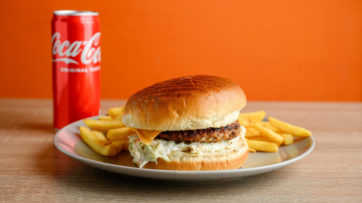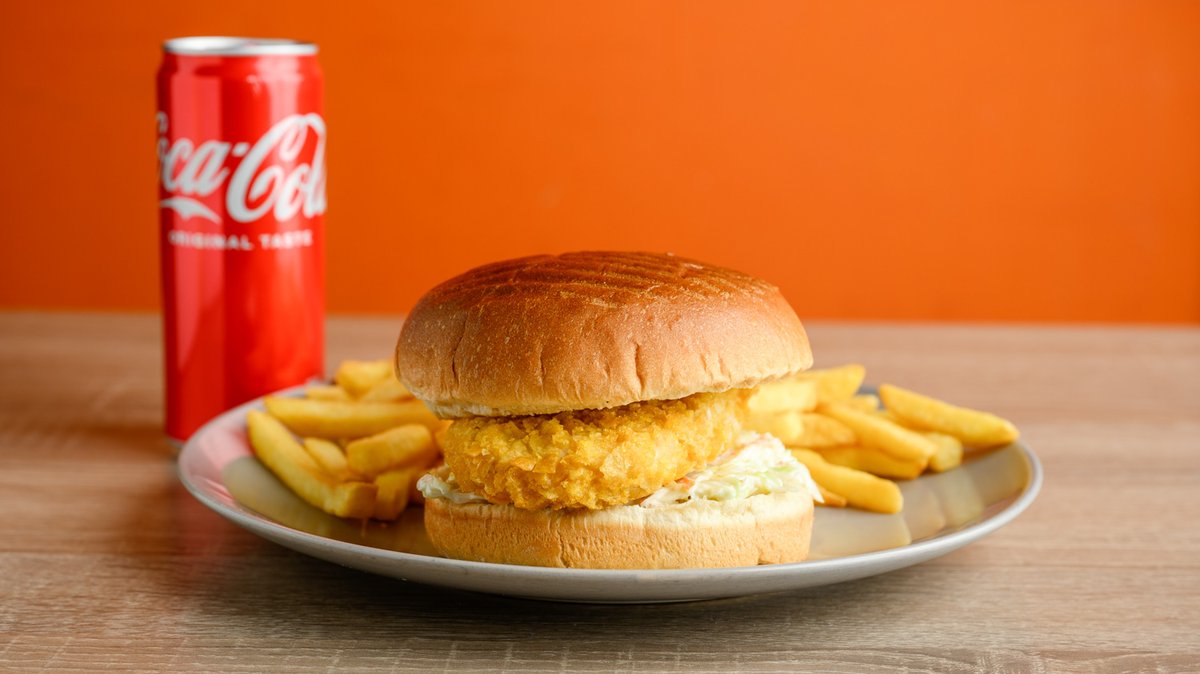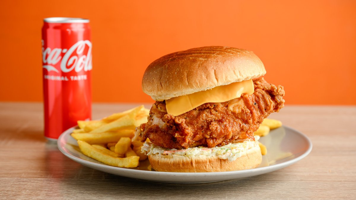 Chicken fillet served in a bun with hash browns, cheese, bacon, mayo, coleslaw, fries and drink.