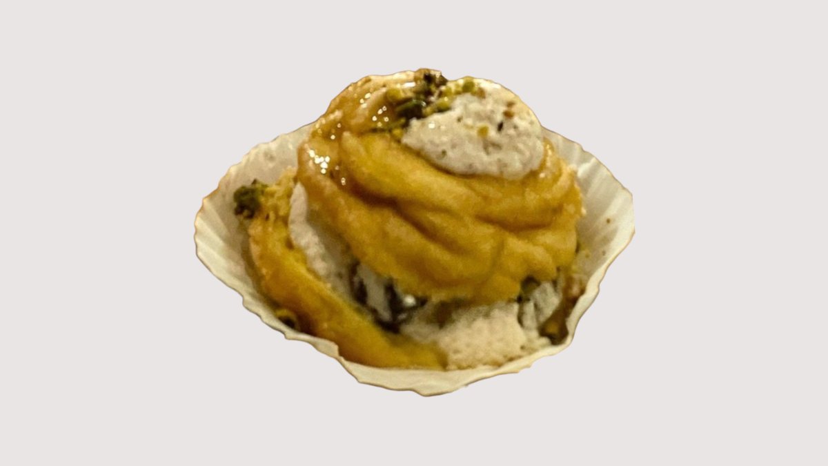 Homemade Gluten Free Zeppoli - Deep fried choux pastry filled with sweetened ricotta, chocolate chips, pistachio crumbs and honey. Approx Weight 115g each. Contains Nuts & Dairy.