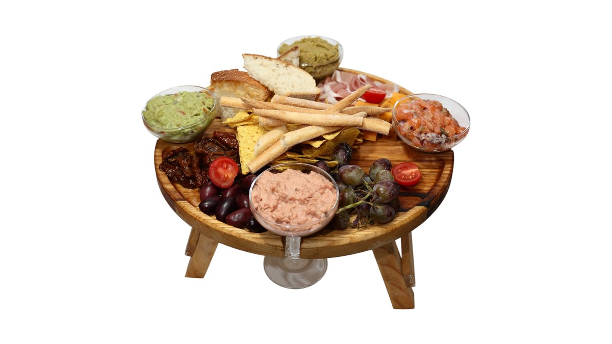 Guacamole, tapenade, nuts, bread, avocado, ricotta with pesto and roasted pepper, cucumber rolls, grapes, sun-dried tomatoes, olives, breadsticks, beetroot hummus, nachos