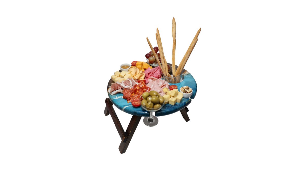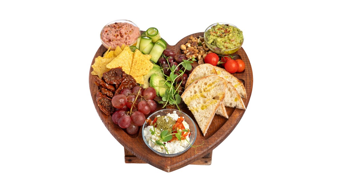 Sun-dried tomatoes, one tartare of your choice, olives, bread, breadsticks, grapes, guacamole, tapenade, jamón, cheese, honey, beetroot hummus, nachos