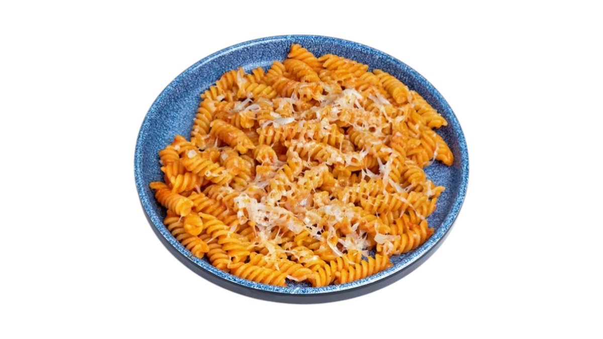 Fresh pasta, shrimps with a beetroot and cream-based sauce with Parmesan