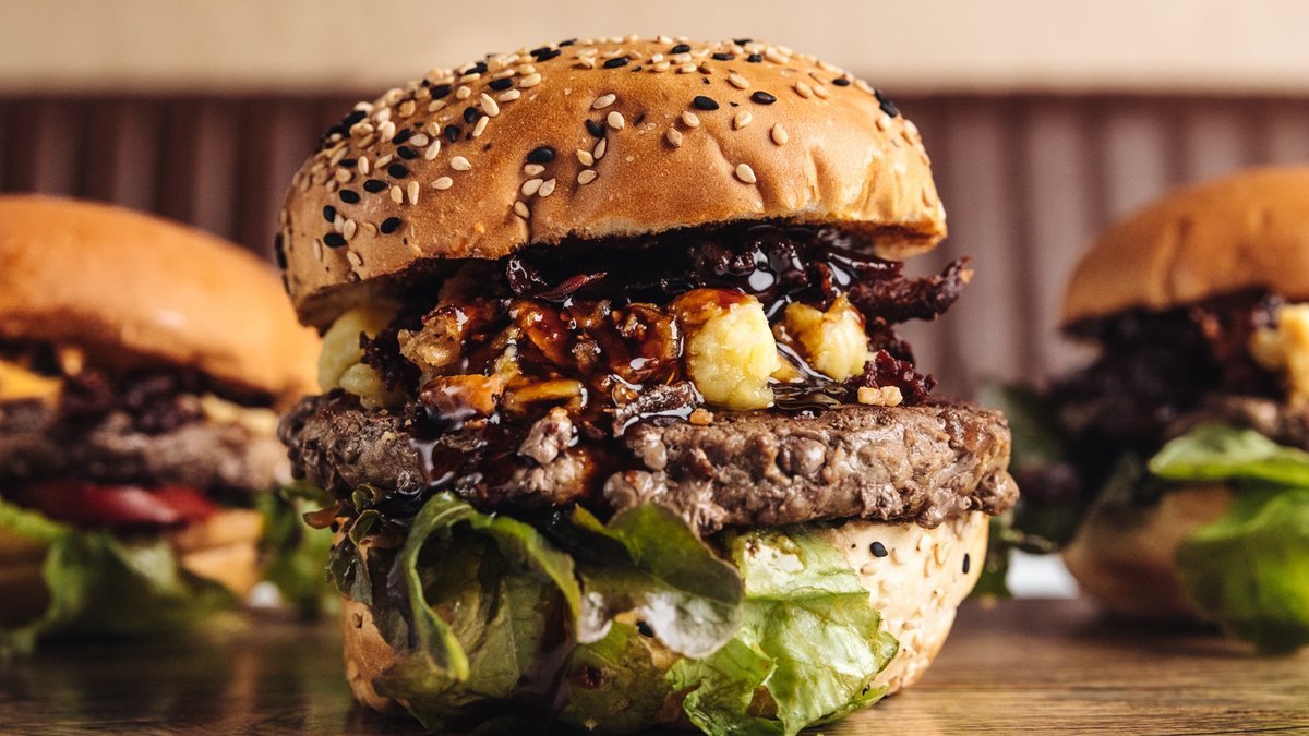 Angus beef burger served in a flaguette bun with onion jam, parmesan cheese, bacon, sautéed mushroom, truffle cream and rucola