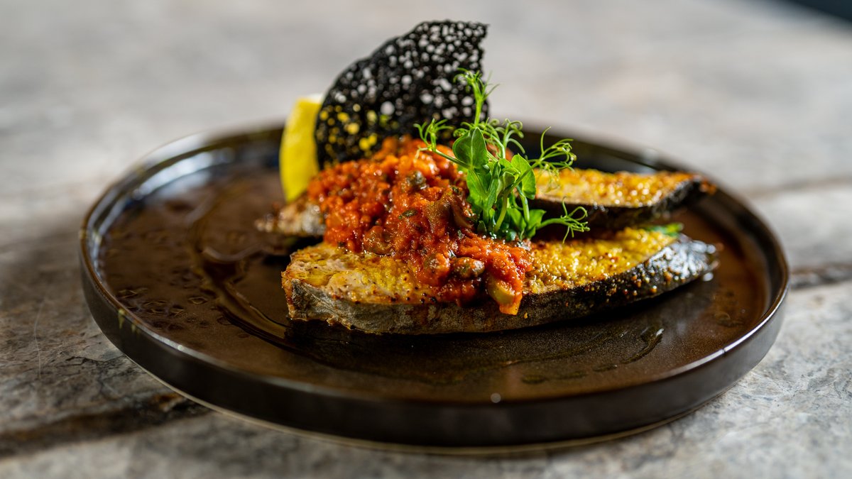 Swordfish served with a traditional maltese olives and caper sauce, salsa verde, lemon pepper, fresh dill and micro greens