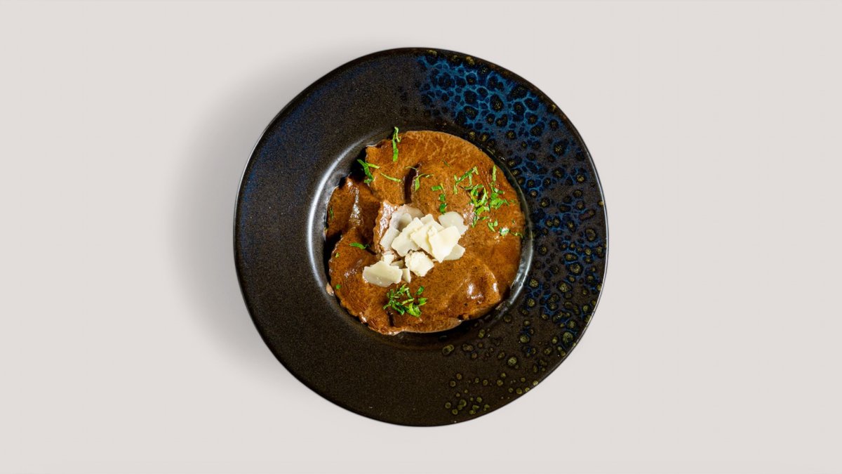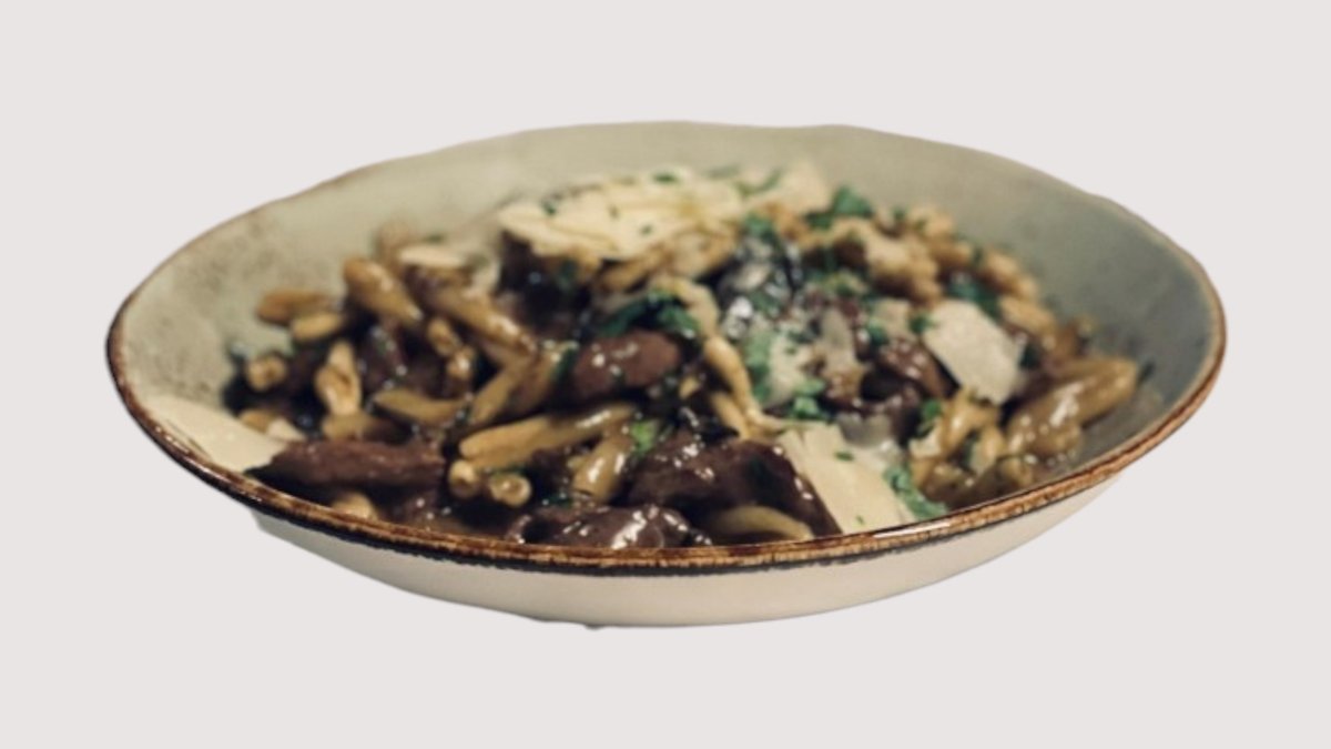 Beef chunks cooked in onions, garlic, mushrooms, truffle cream, and fresh cream topped with Parmesan shavings