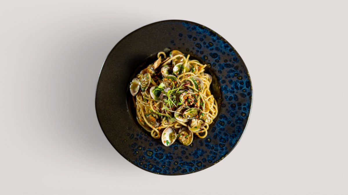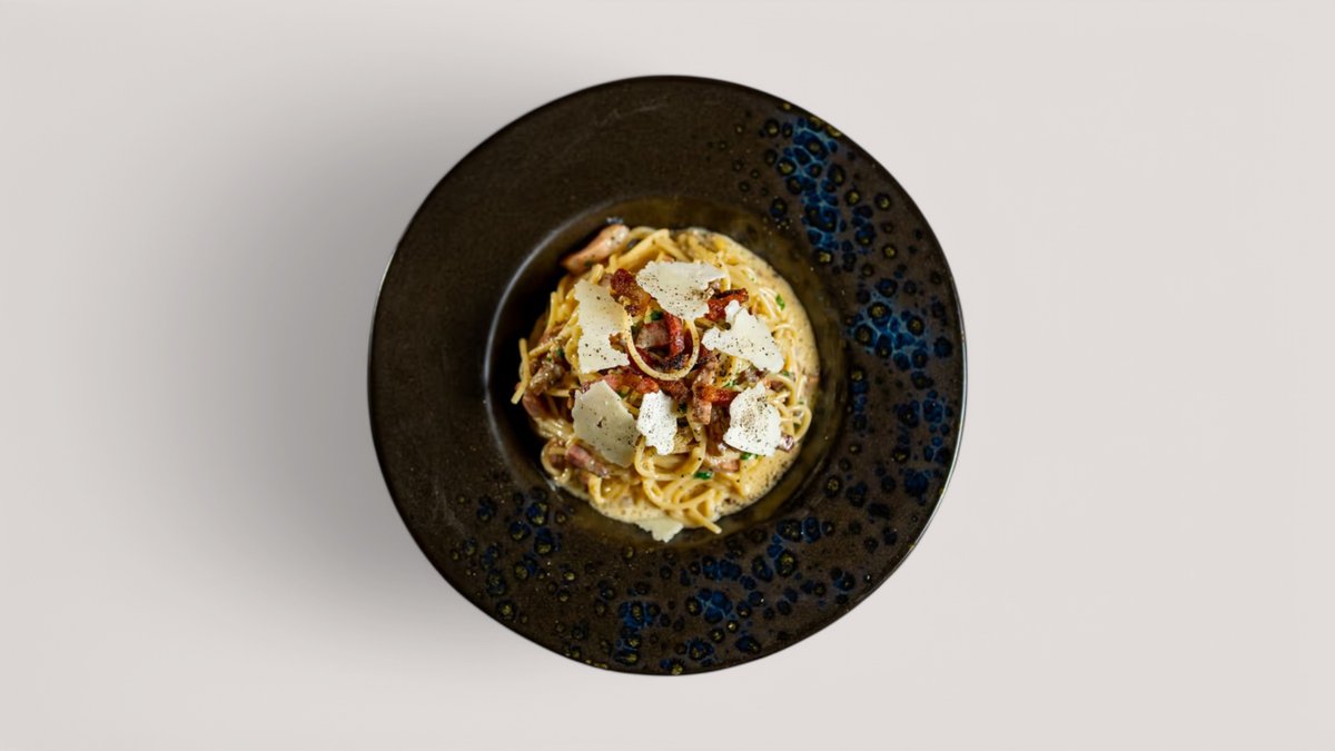 Spaghetti with crispy guanciale, homemade pistachio pesto,cream and grana shavings