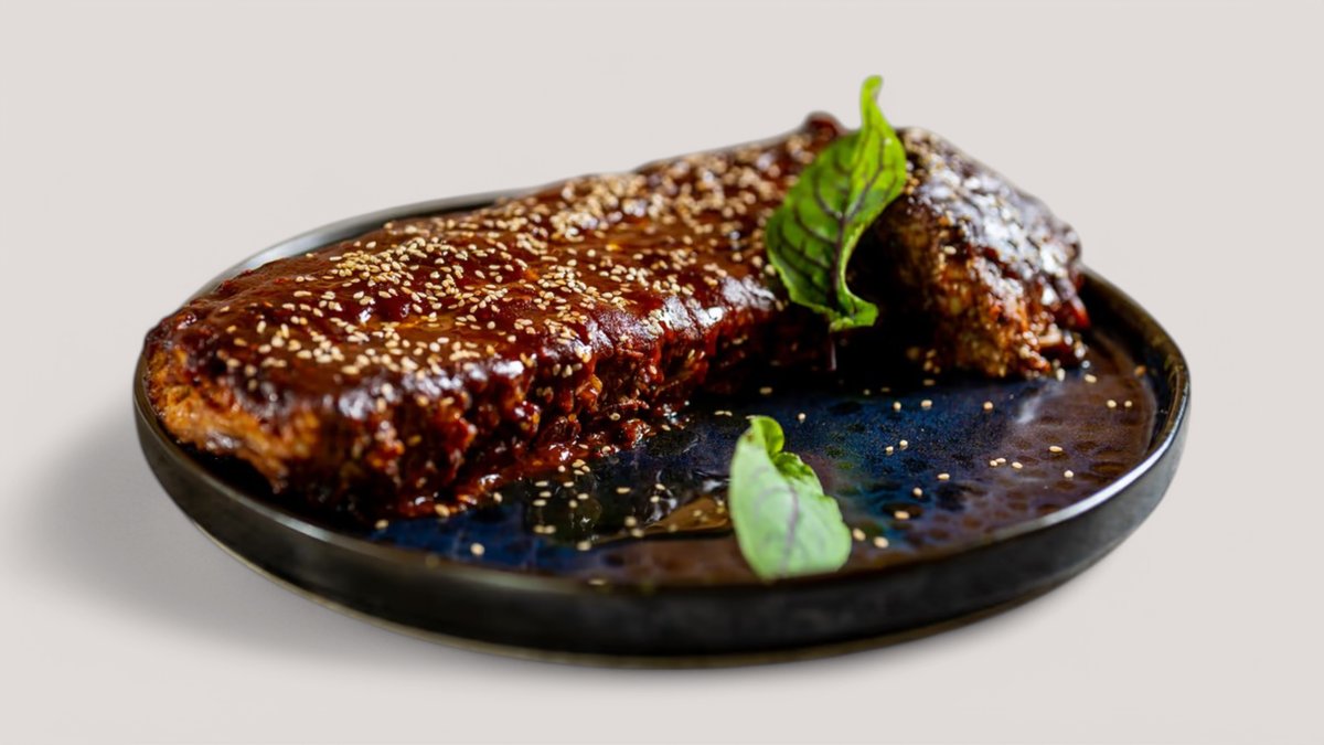 Full rack of pork spare ribs cooked with honey and thyme, served with a slightly spicy bbq sauce and sesame