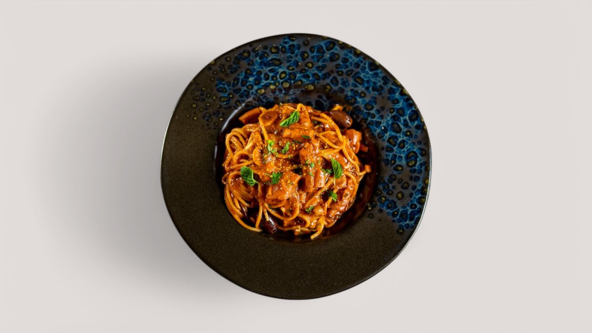 Spaghetti with stewed octopus, tomato sauce, garlic, anchovies, black olives and mint