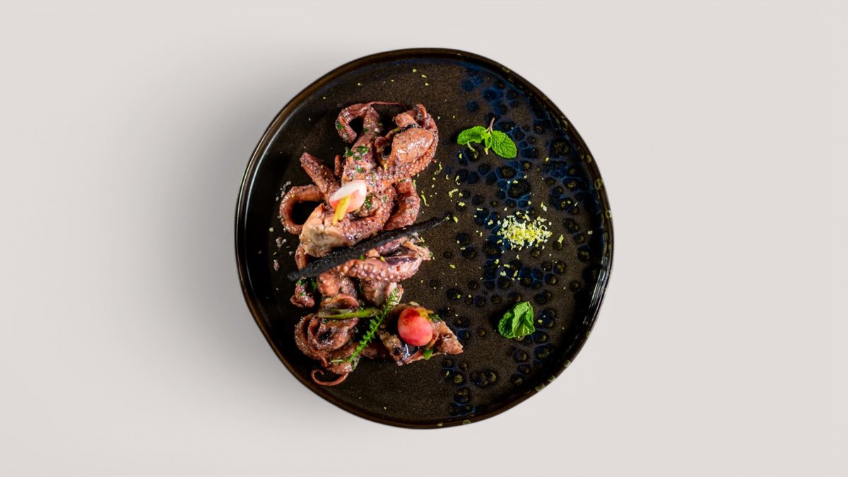 Octopus in garlic with cherry tomatoes, white wine and parsley