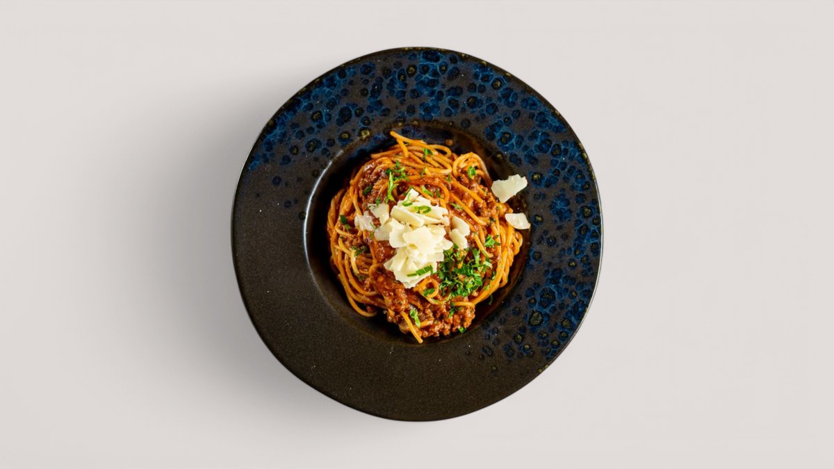 Spaghetti with minced beef, garlic, onions oregano and tomatoes, topped with grana shavings