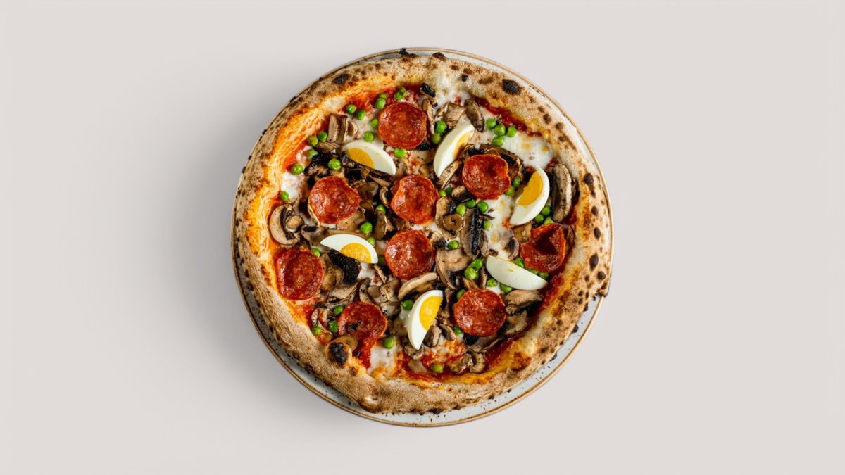 Tomato sauce, mozzarella fior di latte, eggs, mushrooms, peas and pepperoni