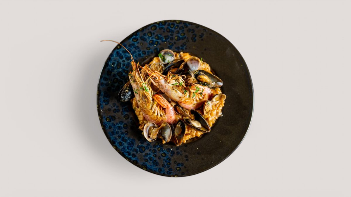 A mix of seafood including mussels, vongole, local prawns, octopus, cheery tomatoes and prawn bisque
