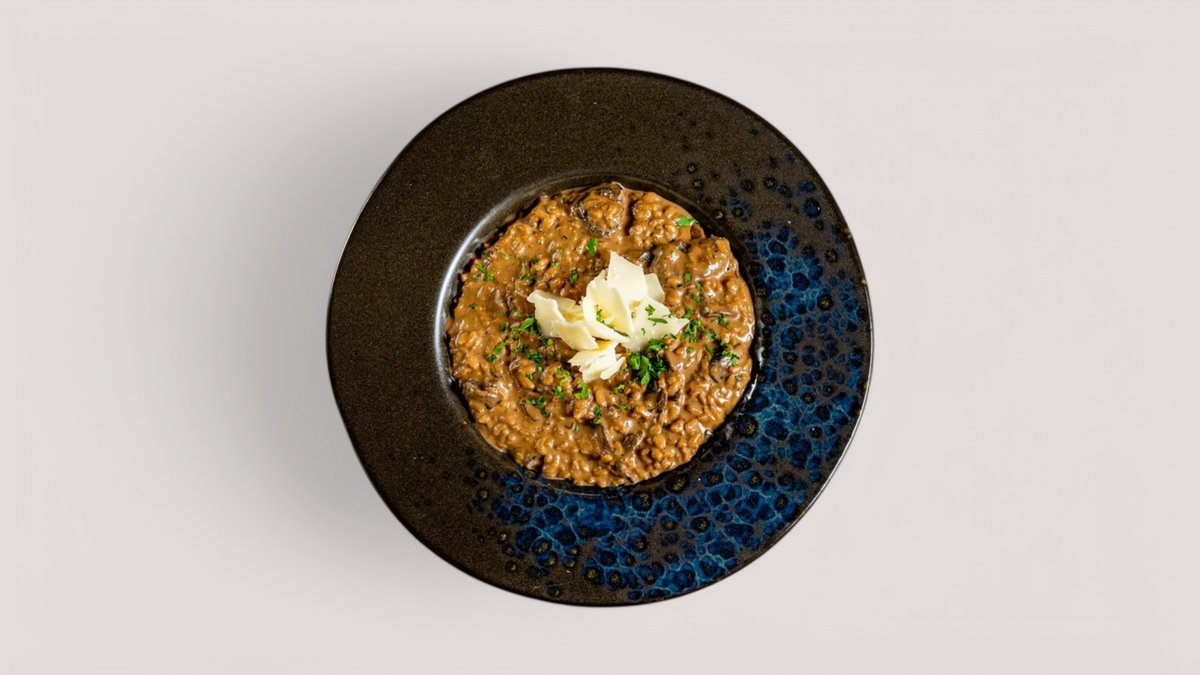 Risotto with chicken, onions, mushrooms and whipped cream with grana shavings