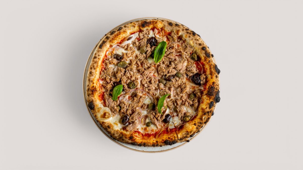 Tomato sauce, mozzarella fior di latte, tuna, onions, capers, olives and basil