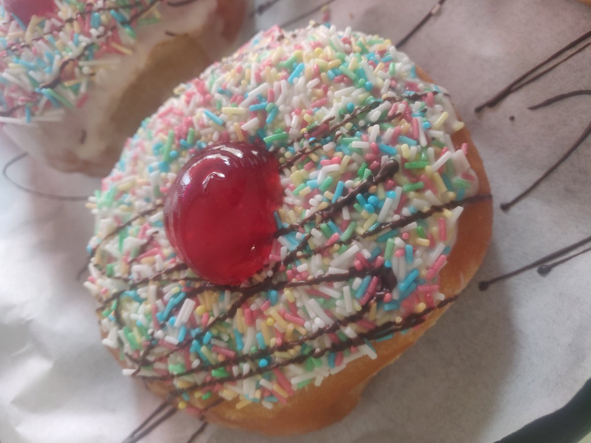 White chocolate filled donut, covered in white chocolate and sprinkles