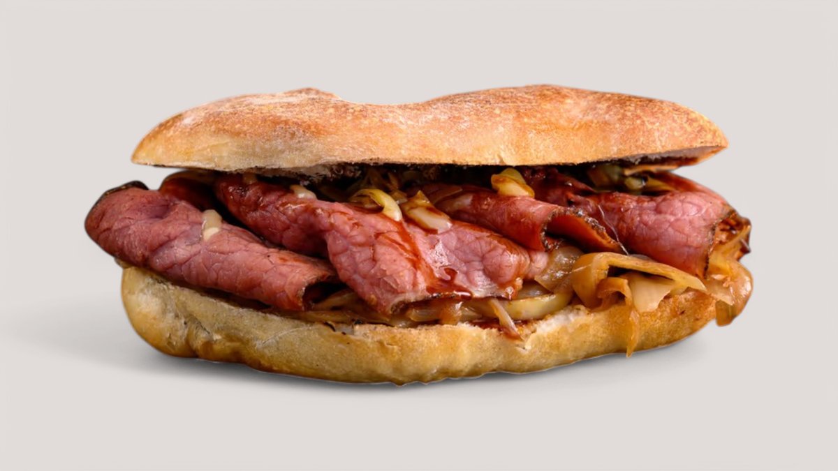 Ciabatta Bun, Butter, Spiced Rum Sauce, Braised Onions, Smoked Beef Pastrami, Cheddar Cheese.