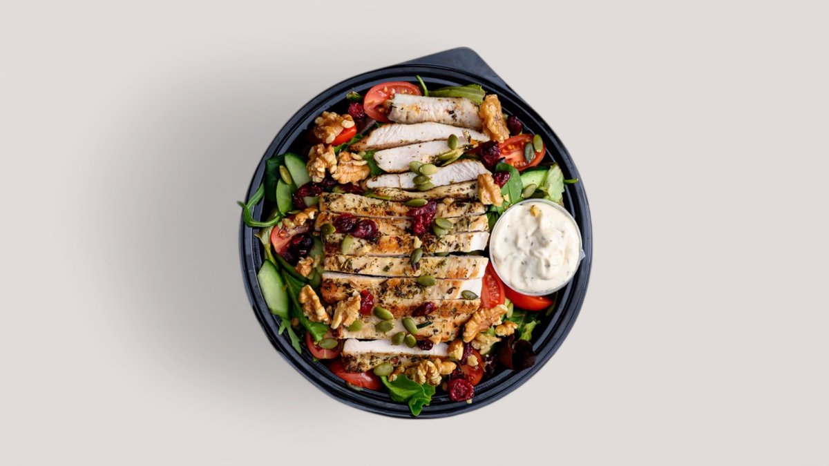 Mixed salad, grilled chicken breast, cucumber, cherry tomatoes, pumpkin seeds, dried cranberries, walnuts, and homemade garlic sauce on the side. If you have any questions regarding allergies or intolerances related to ingredients, please contact us