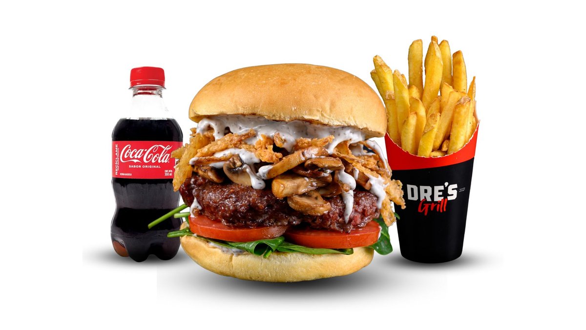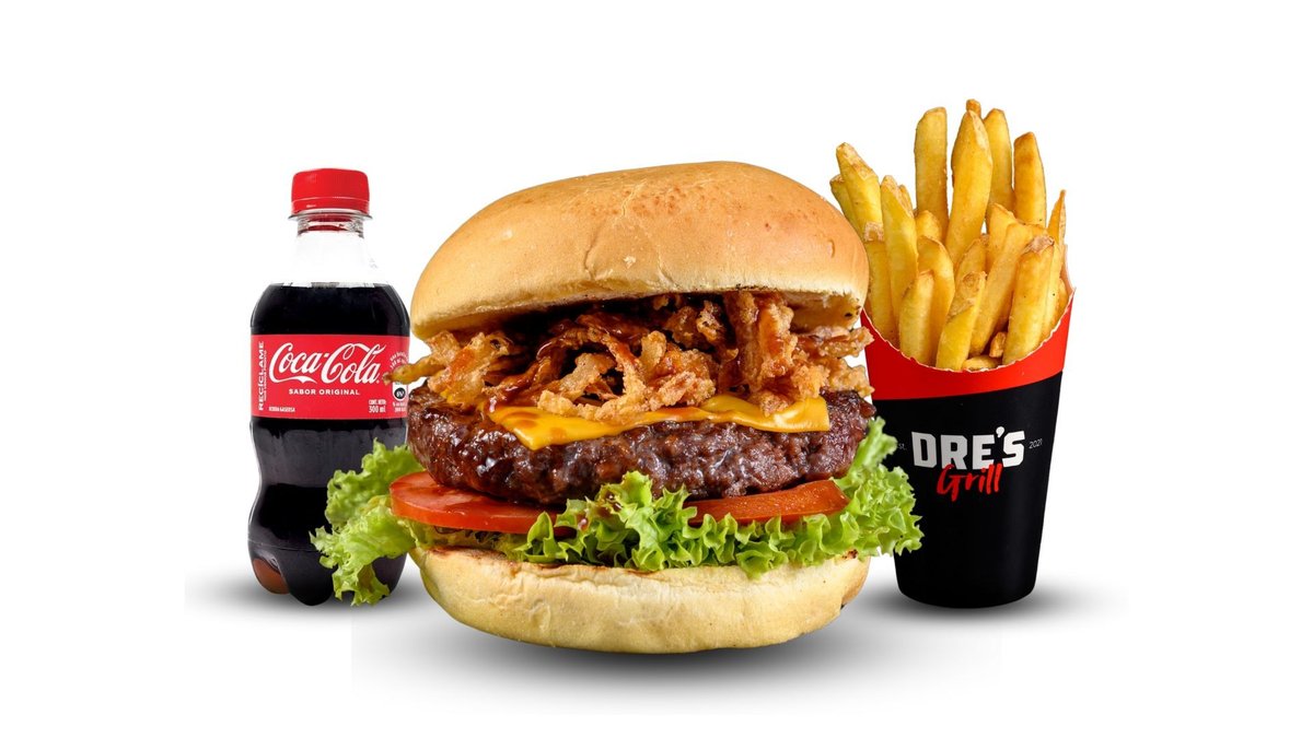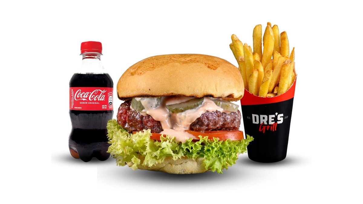 Brioche Bun, 200g Beef Patty, Cheddar Cheese. Served with fries and a soft drink.