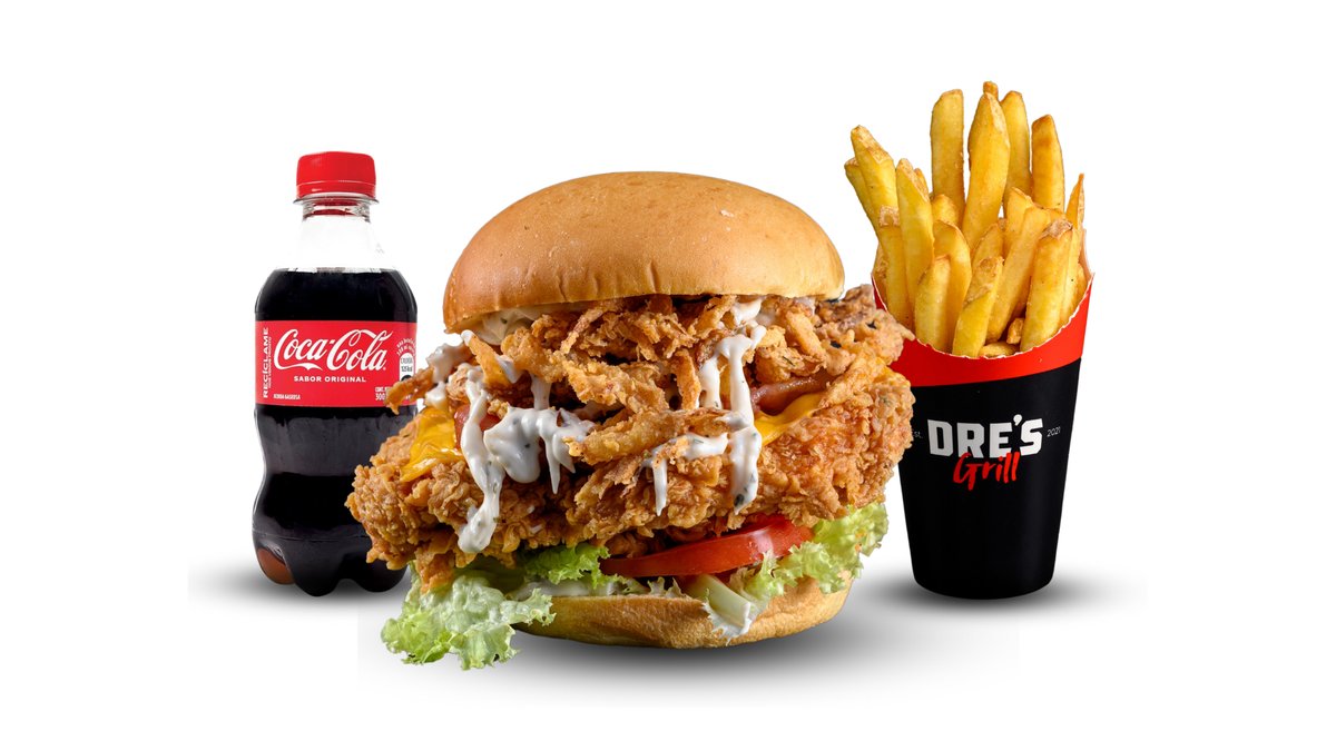 Brioche bun, crispy chicken, lettuce, tomatoes, crispy bacon, crispy onions, American cheese and homemade garlic sauce. Served with fries and a soft drink. If you have any questions regarding allergies or intolerances related to ingredients, please contact us