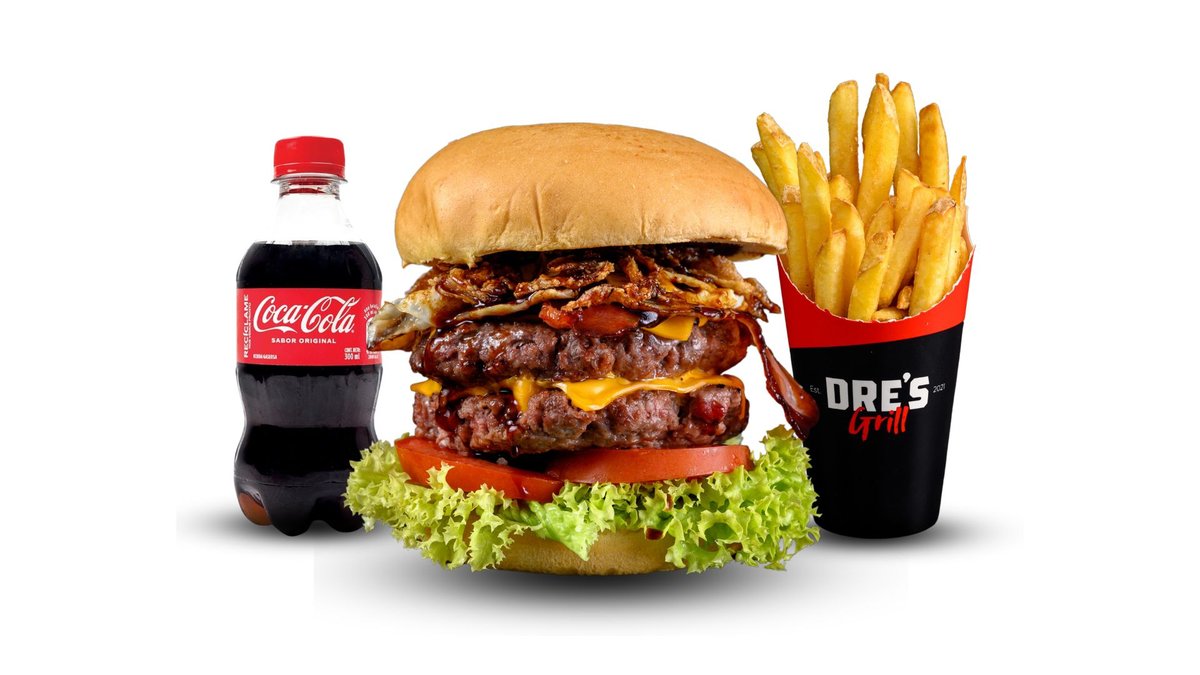 Brioche bun, 100g x2 angus beef patties, lettuce, tomatoes, american cheese, crispy onions, crispy bacon, egg and homemade spiced rum sauce. Served with fries and a soft drink. If you have any questions regarding allergies or intolerances related to ingredients, please contact us