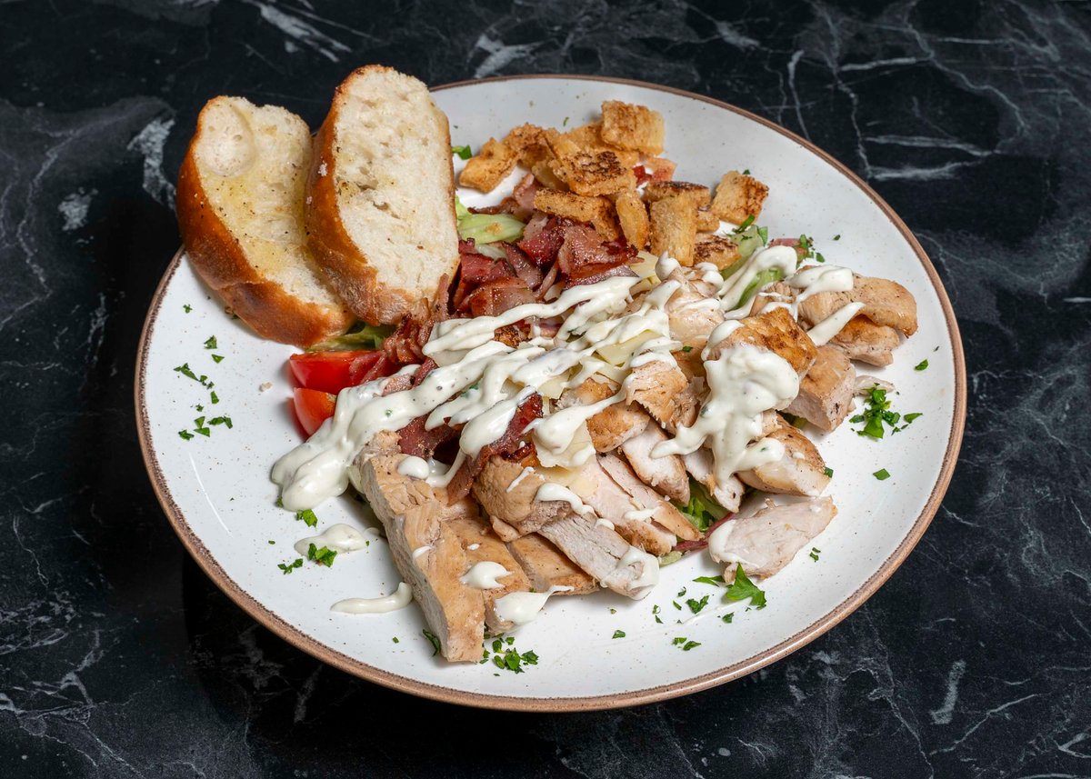 Chicken breast, bacon, parmesan shavings, lettuce, croutons and homemade caesar sauce