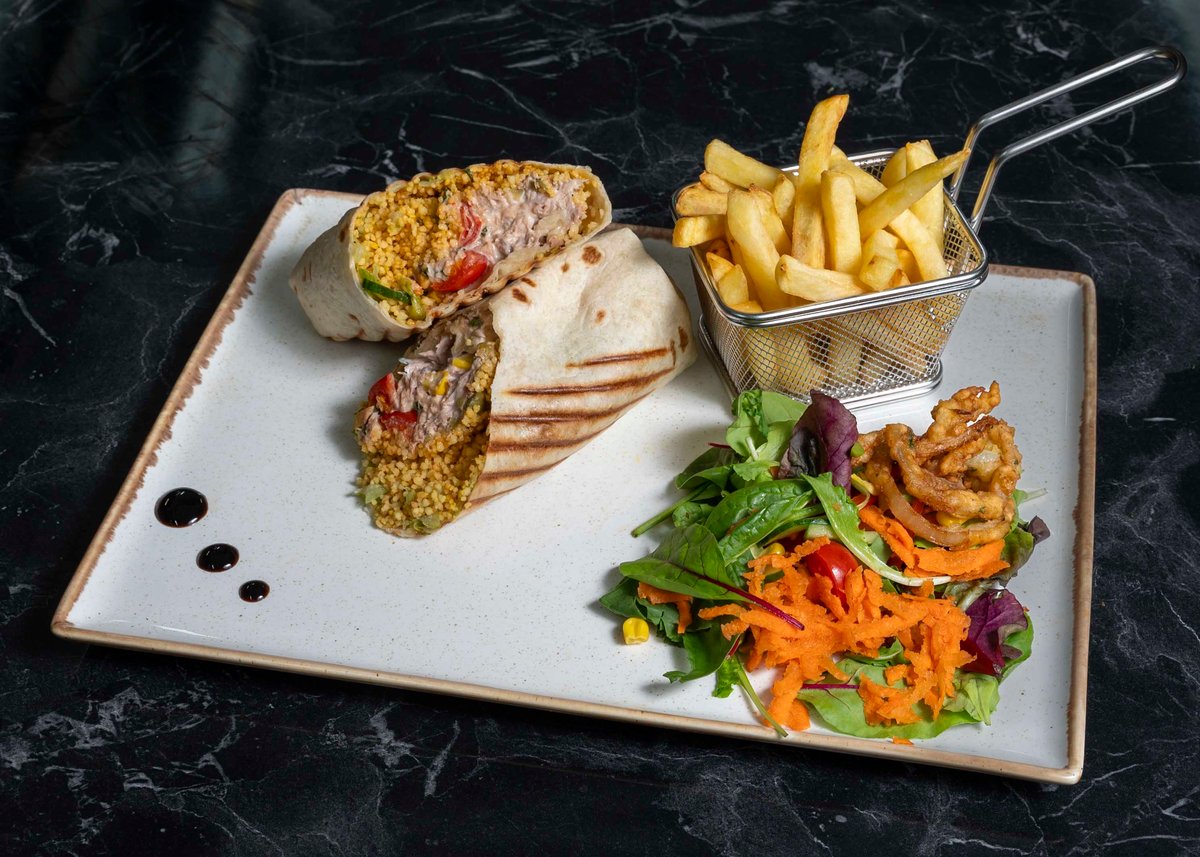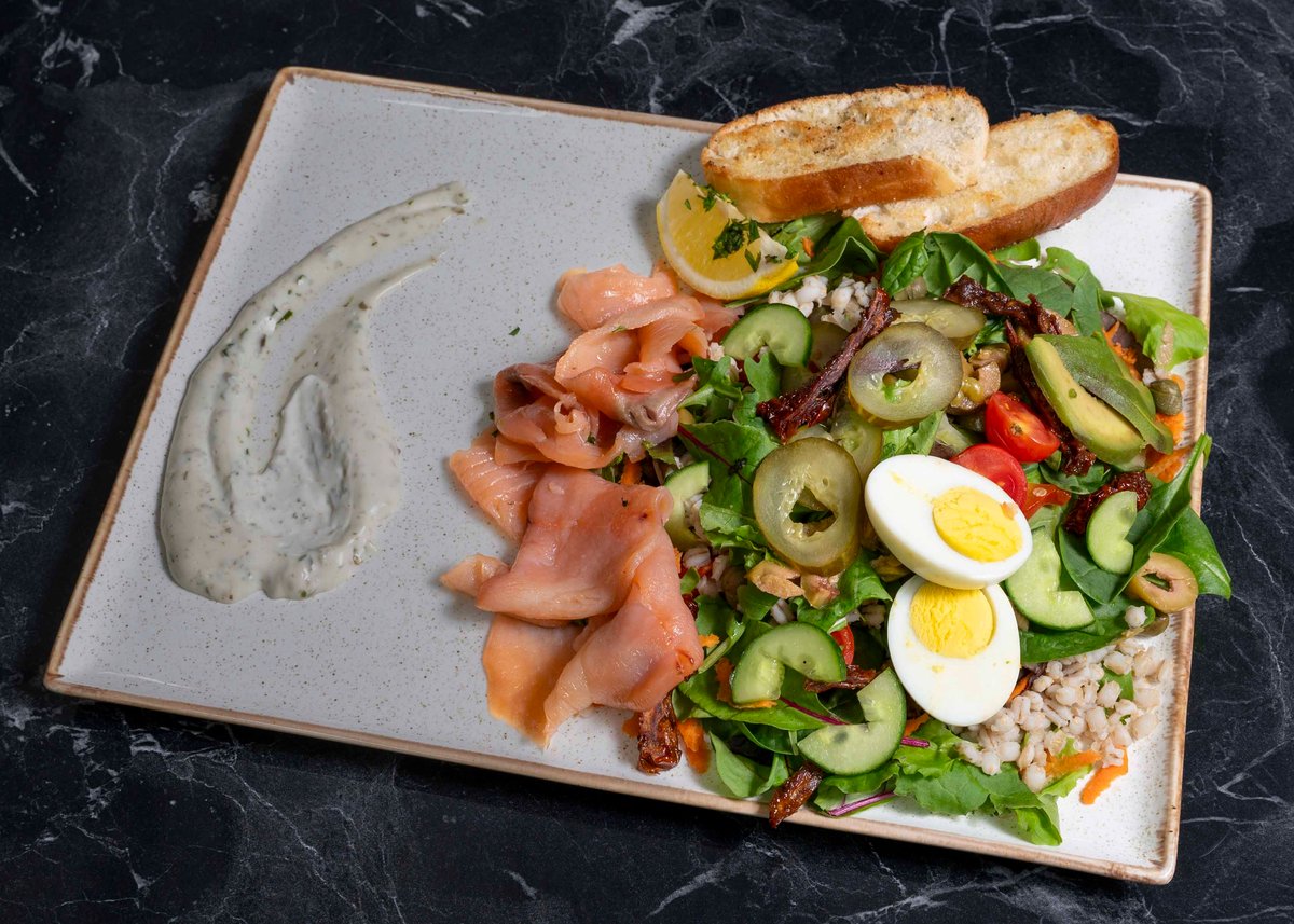 Smoked salmon, boiled egg, barley, avocado, mixed leaves, tomatoes, spinach, capers, olives, cucumber, onions and tartar sauce