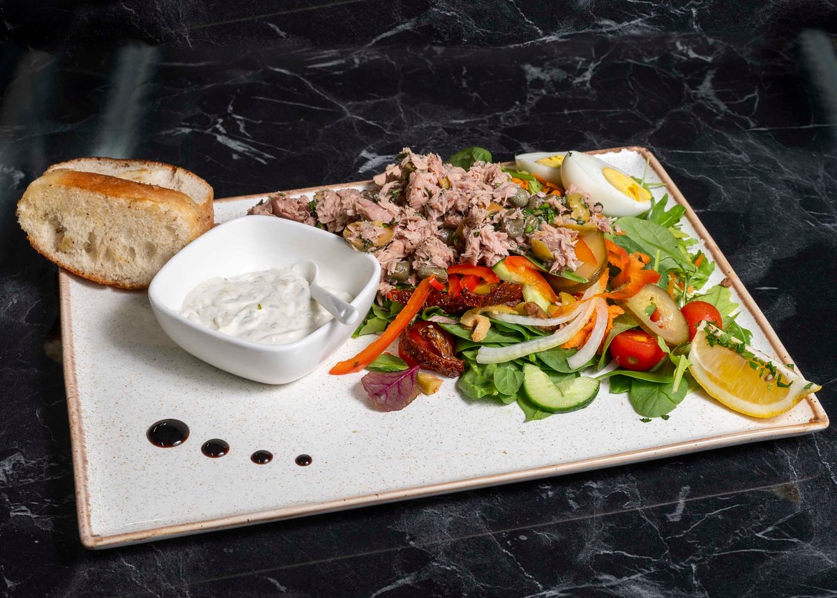 Tuna, boiled egg, mixed leaves, tomatoes, olives, onions, cucumber and gherkins