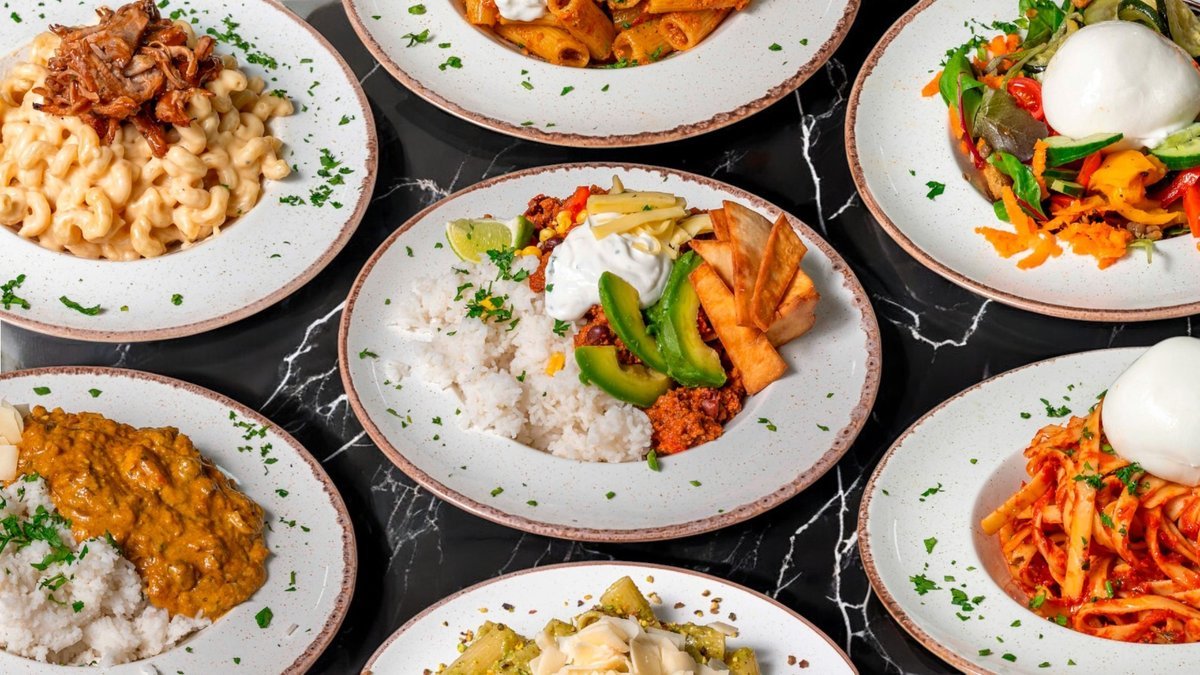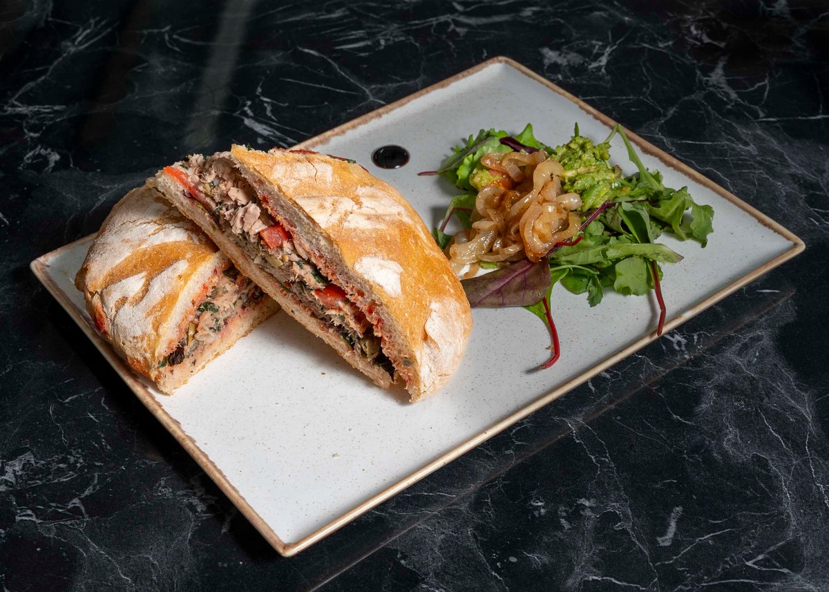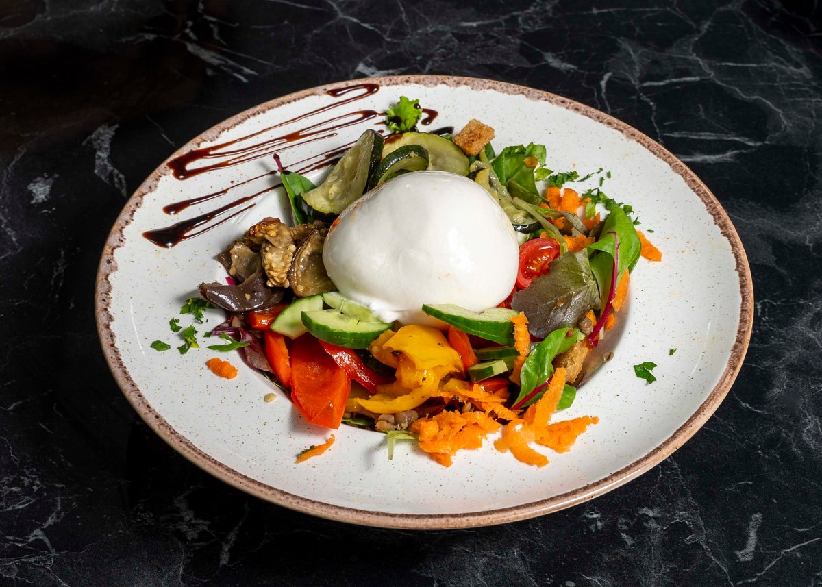 Burrata, mixed leaves, grilled vegetables, tomatoes, olives and basil pesto dressing