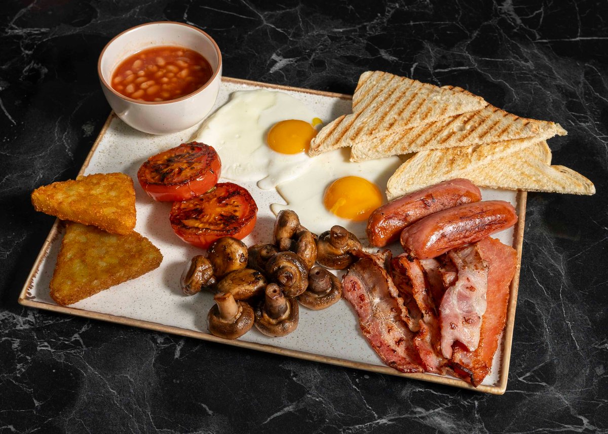 Sausages, bacon, eggs, baked beans, hashbrowns, tomatoes, mushrooms and toast