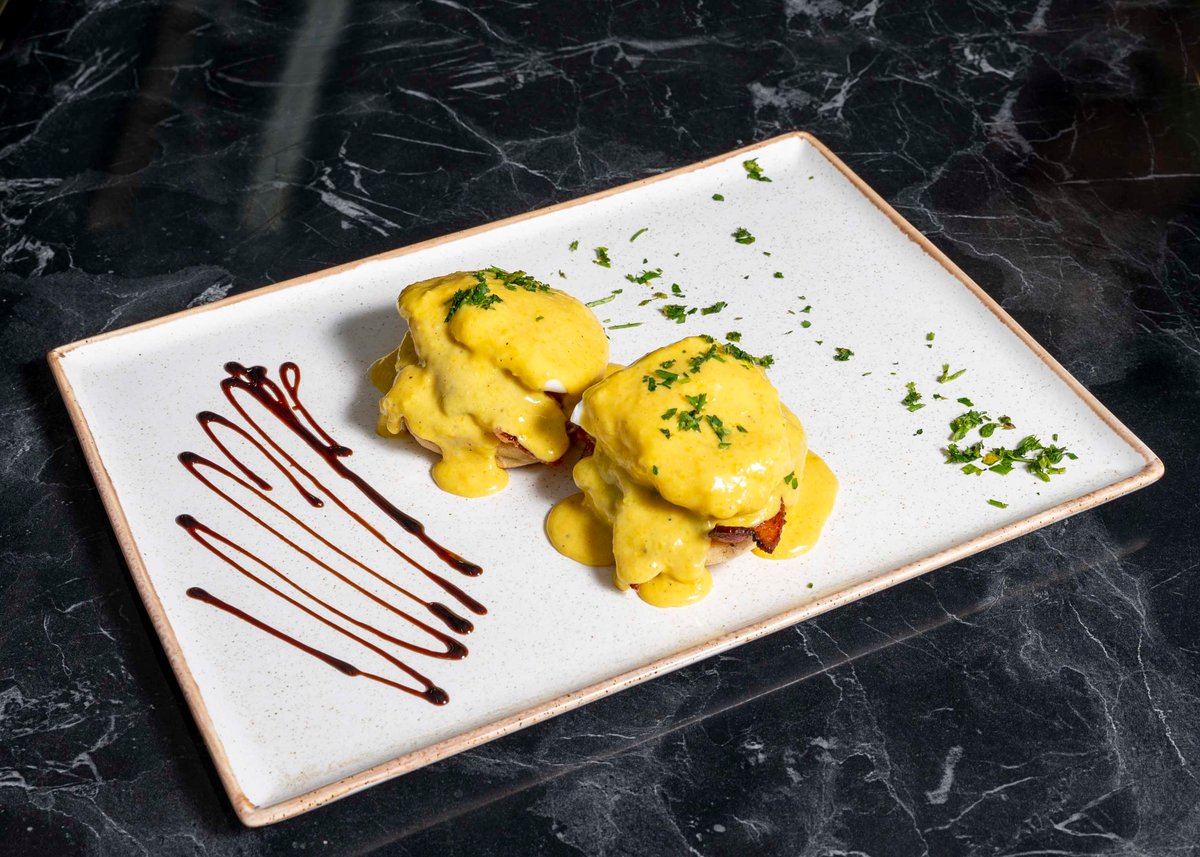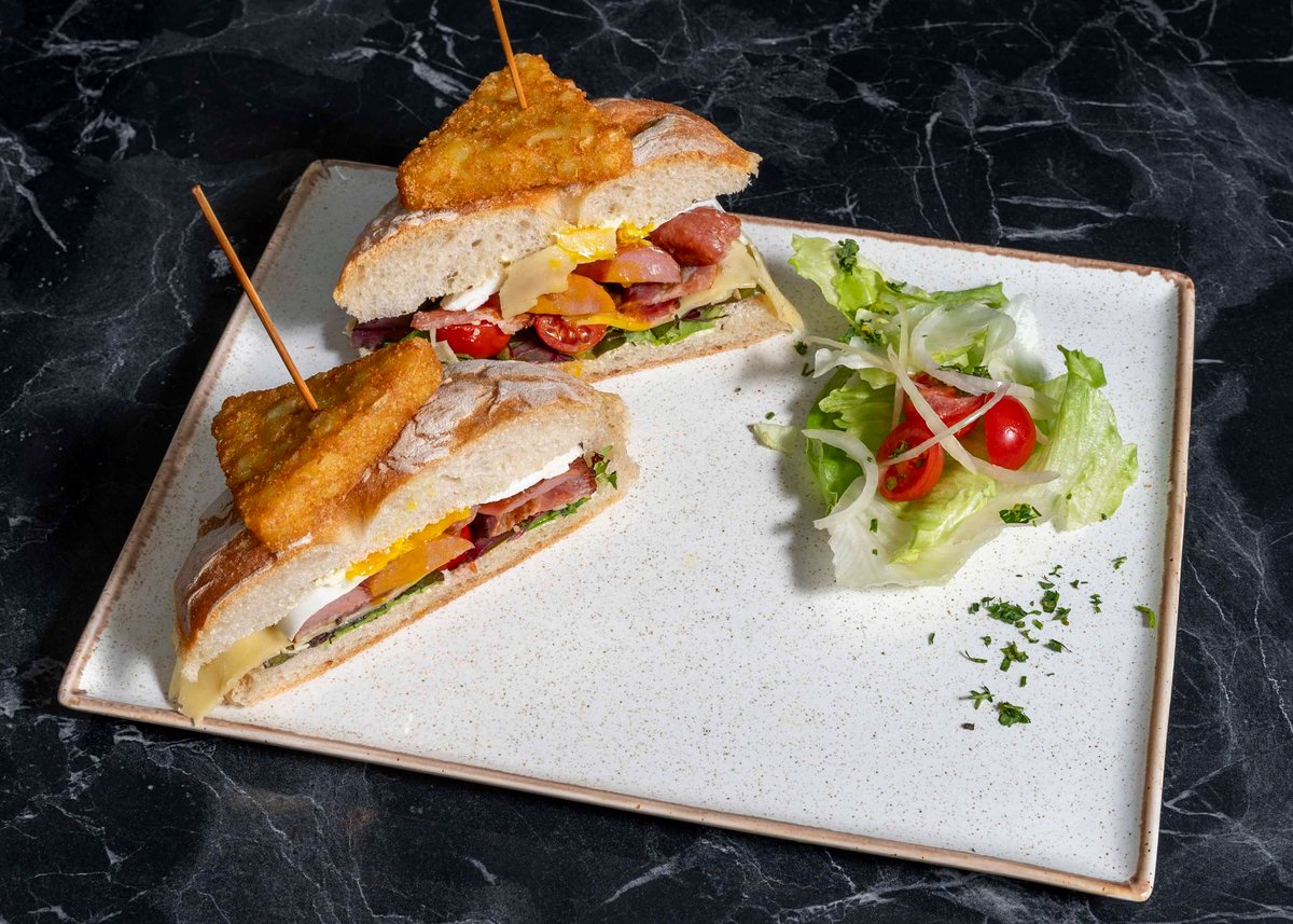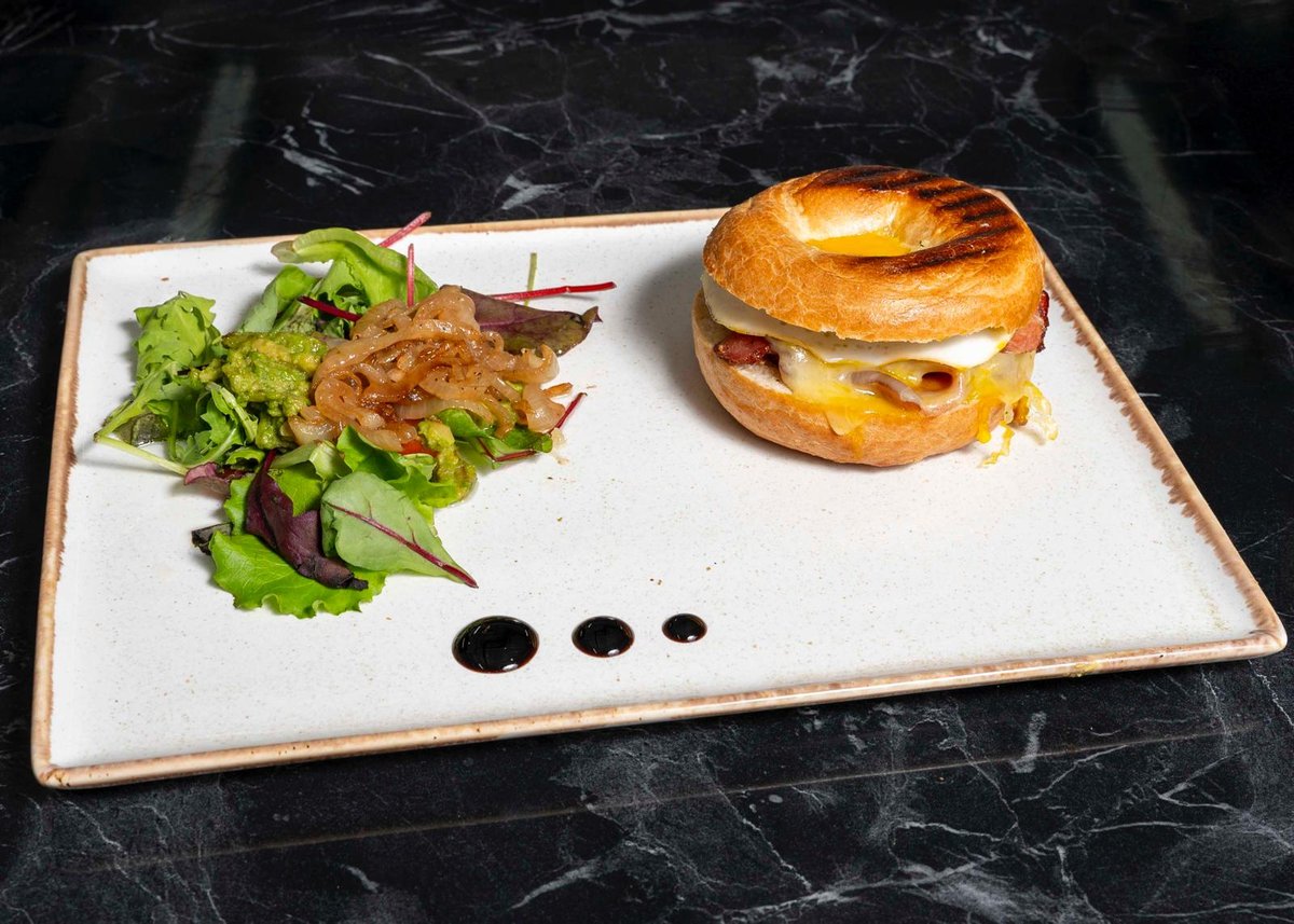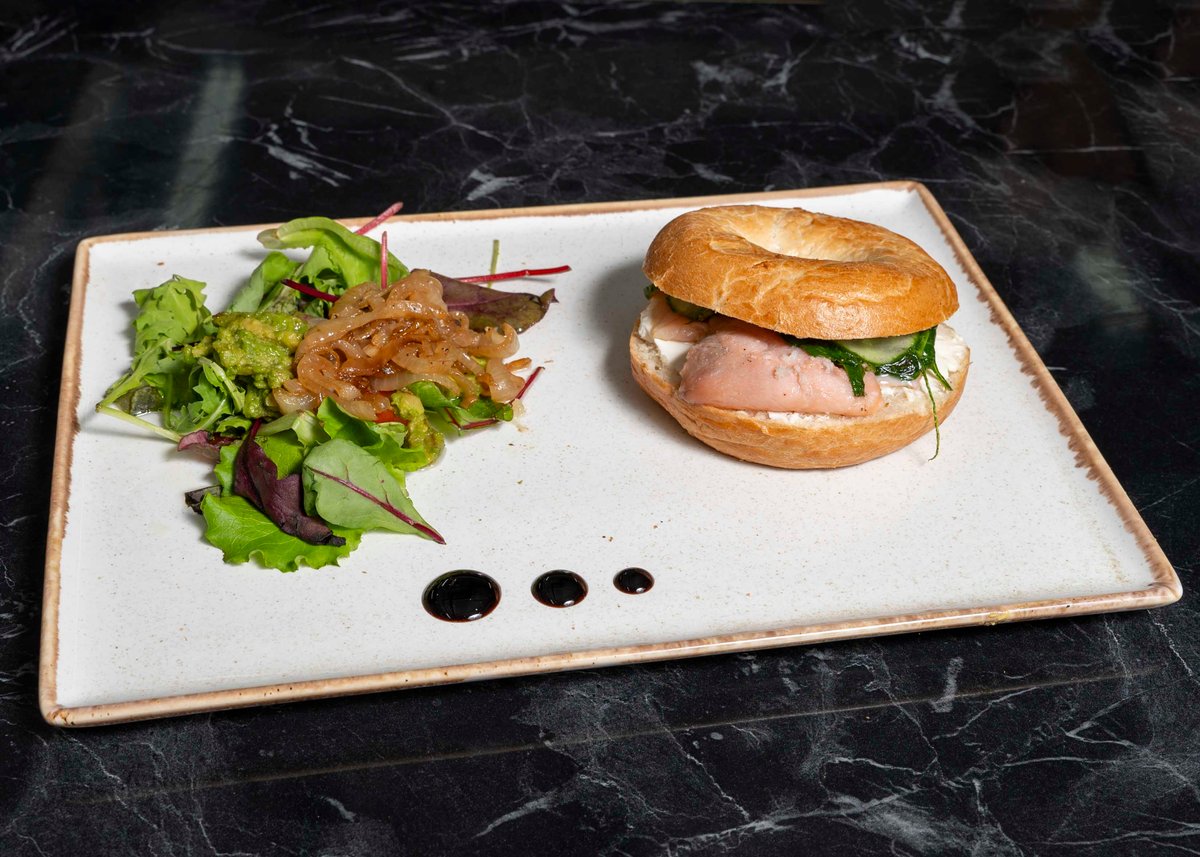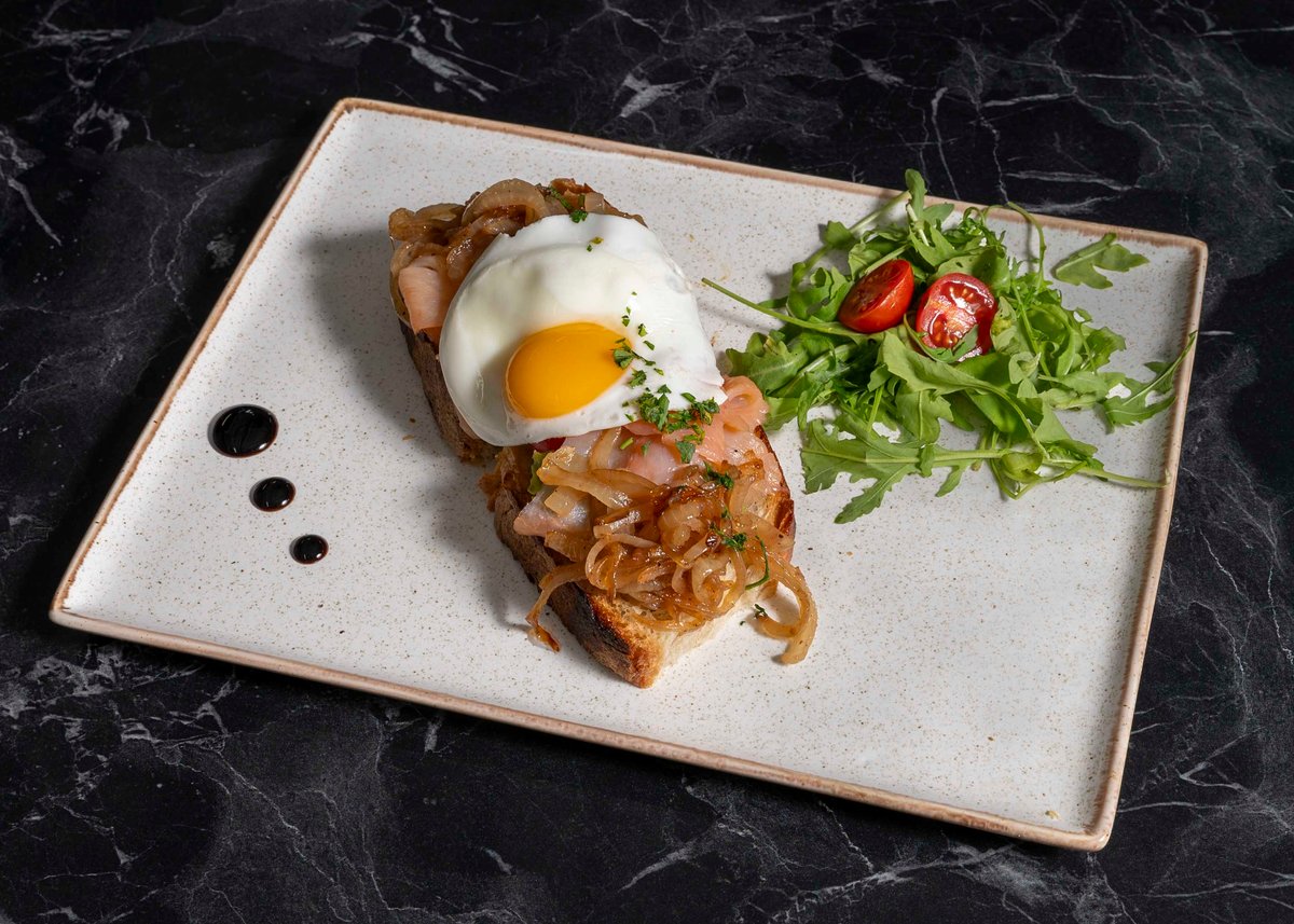 Toast, smoked salmon, fried egg, cream cheese, avocado and caramelised onions