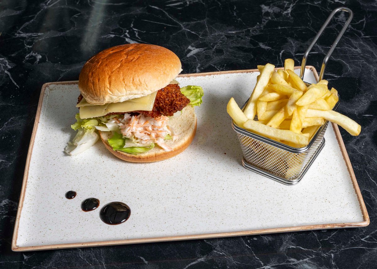 Homemade breaded chicken breast patty, lettuce, cheese, tomato and mayonnaise