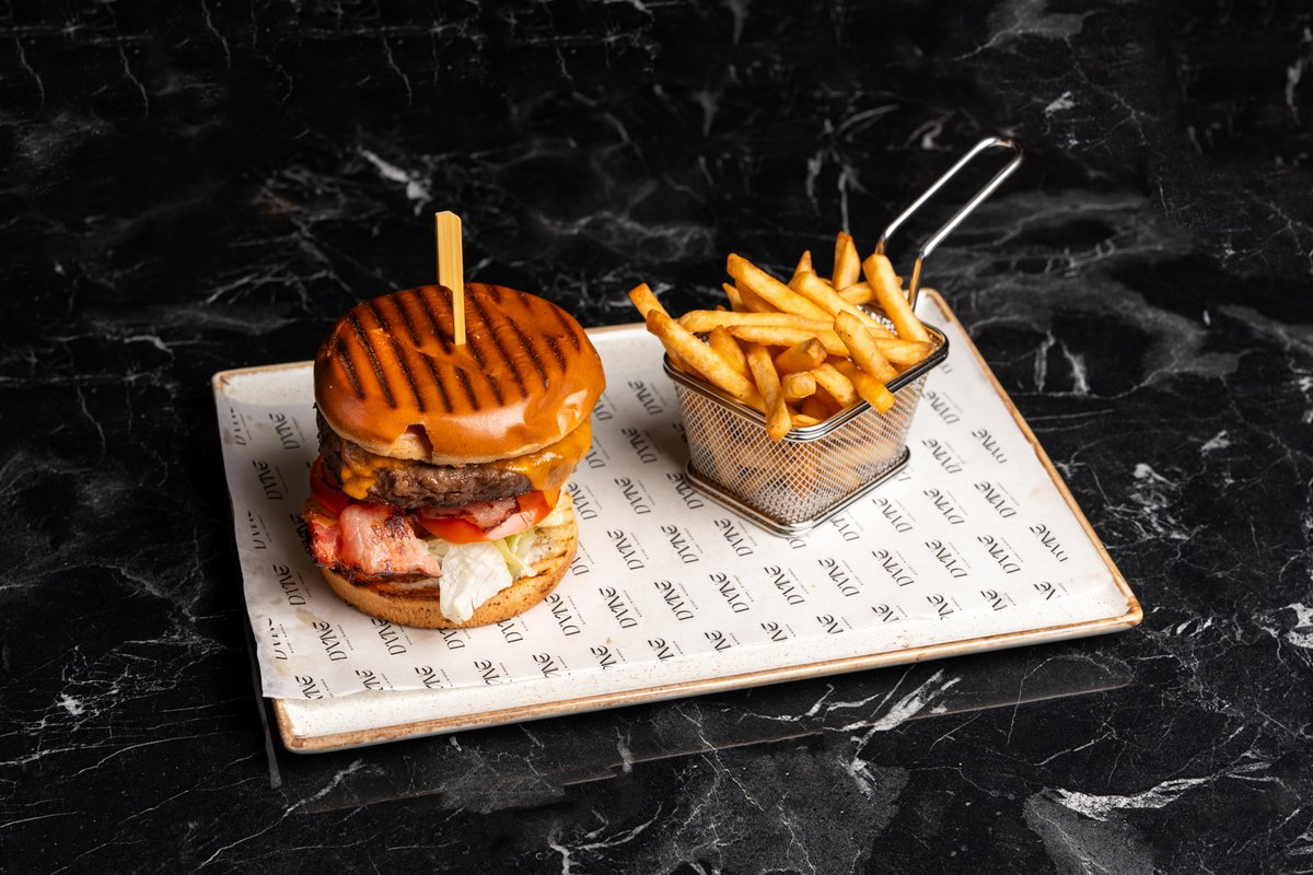 250g homemade beef patty, onion rings, red leicester cheese, truffle mayo, lettuce, bacon and tomato