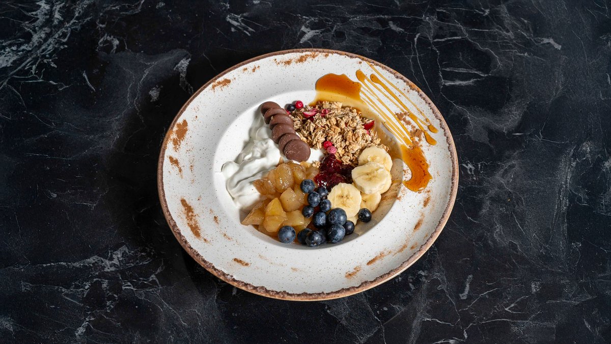 Greek Yogurt, Granola, Fruit, Nuts, Chocolate Chips & Maple Syrup