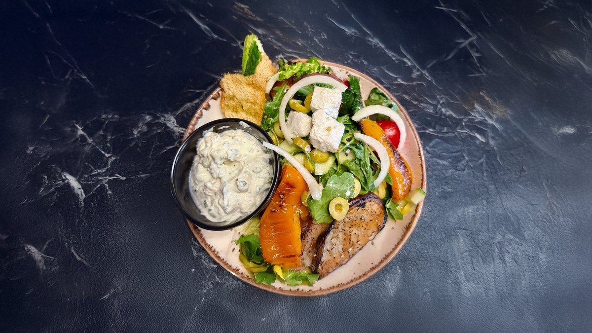 Grilled Vegetables, Feta Cheese, Walnuts, Mixed Leaves, Cucumber, Tomatoes, Olives, Tzatziki
