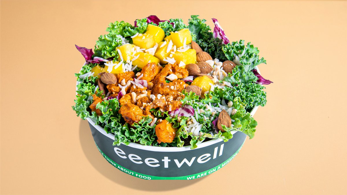 Fan Favourite 💚 Roasted chicken thighs, basmati rice, cucumber, cherry tomatoes, red onion, sweet corn, peppers, kale, curry, and coriander dressing. 520kcal, / 22g P/ 54g C/ 25g F