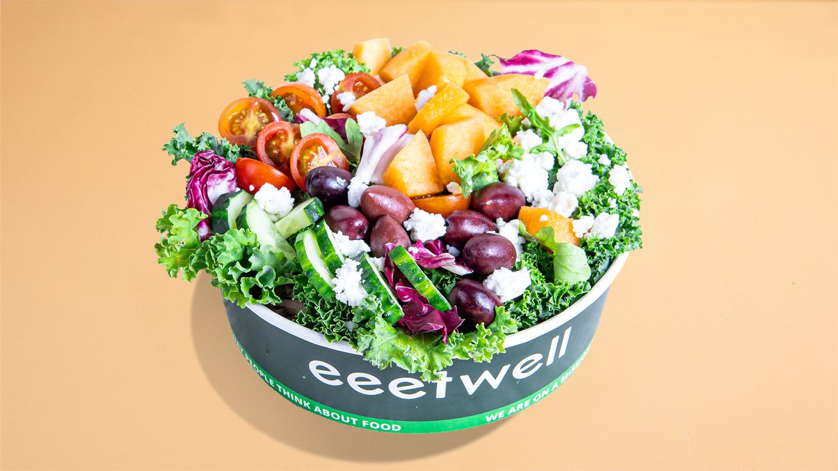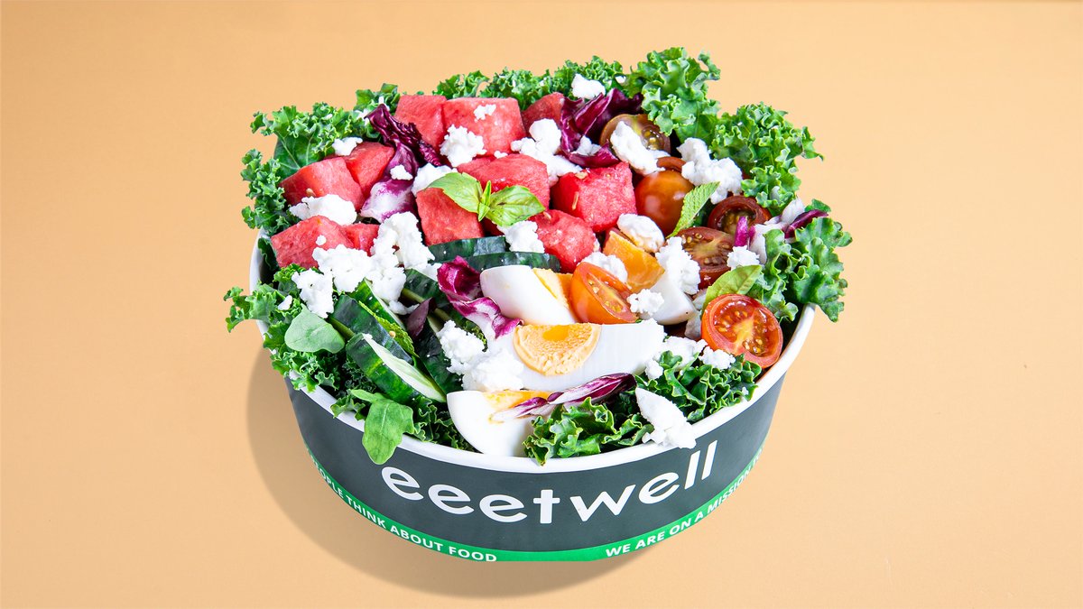 Mixed greens, maple balsamic dressing, cucumber, cherry tomatoes, mint, boiled egg, feta cheese, watermelon. 381 kcal,17g P / 24g C / 25g F