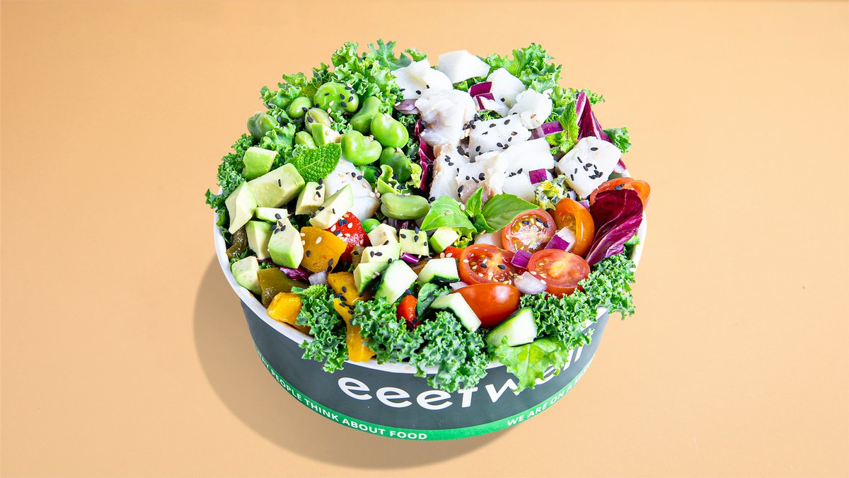 Steamed cod, cherry tomatoes, avocado, red onion, sesame seeds, fava beans, cucumber, basil, roasted bell peppers, mint, lemon teriyaki dressing, mixed greens. 416 kcal, 28g P / 38g C / 20g F