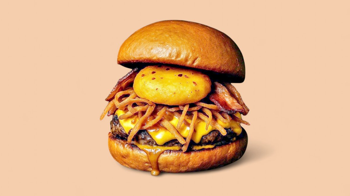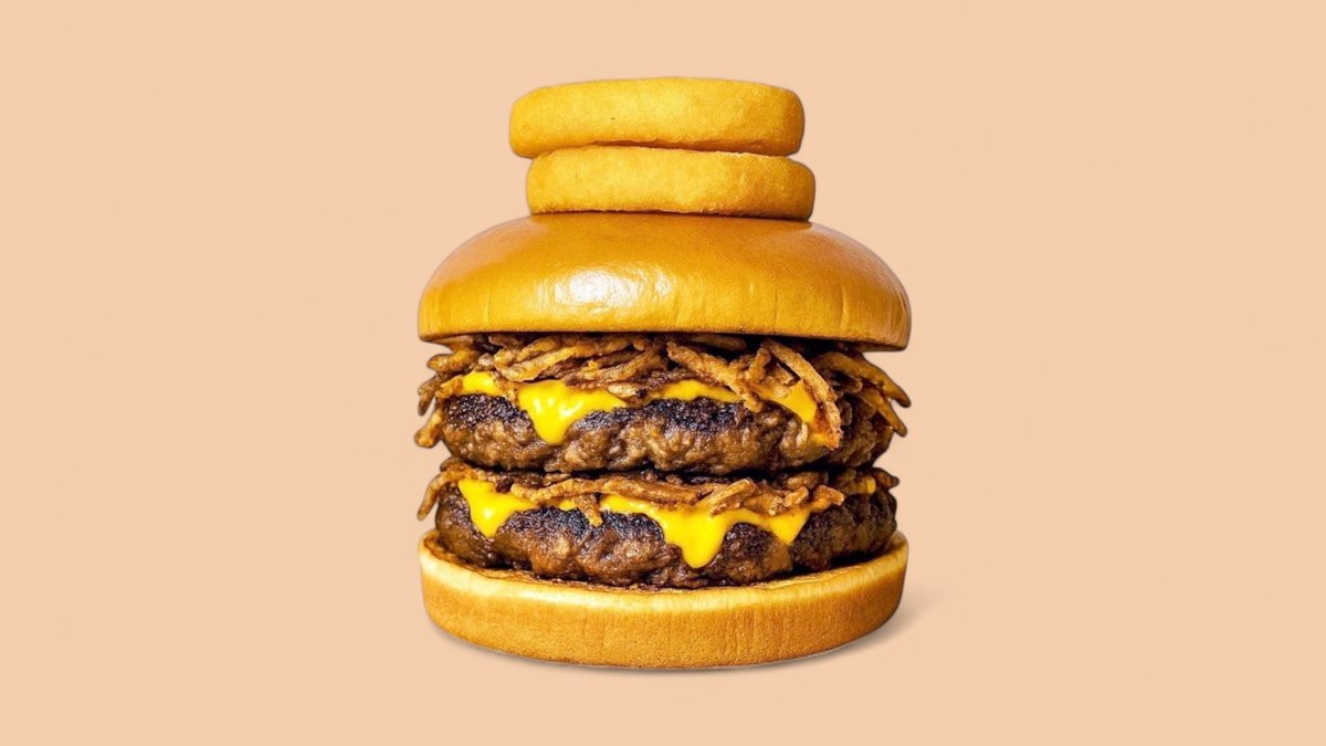 Two juicy beef patties stacked with melted cheese, crispy bacon, crunchy onion rings, golden fried onions and our house sauce. Big, bold and built for serious appetite. Served with fries.