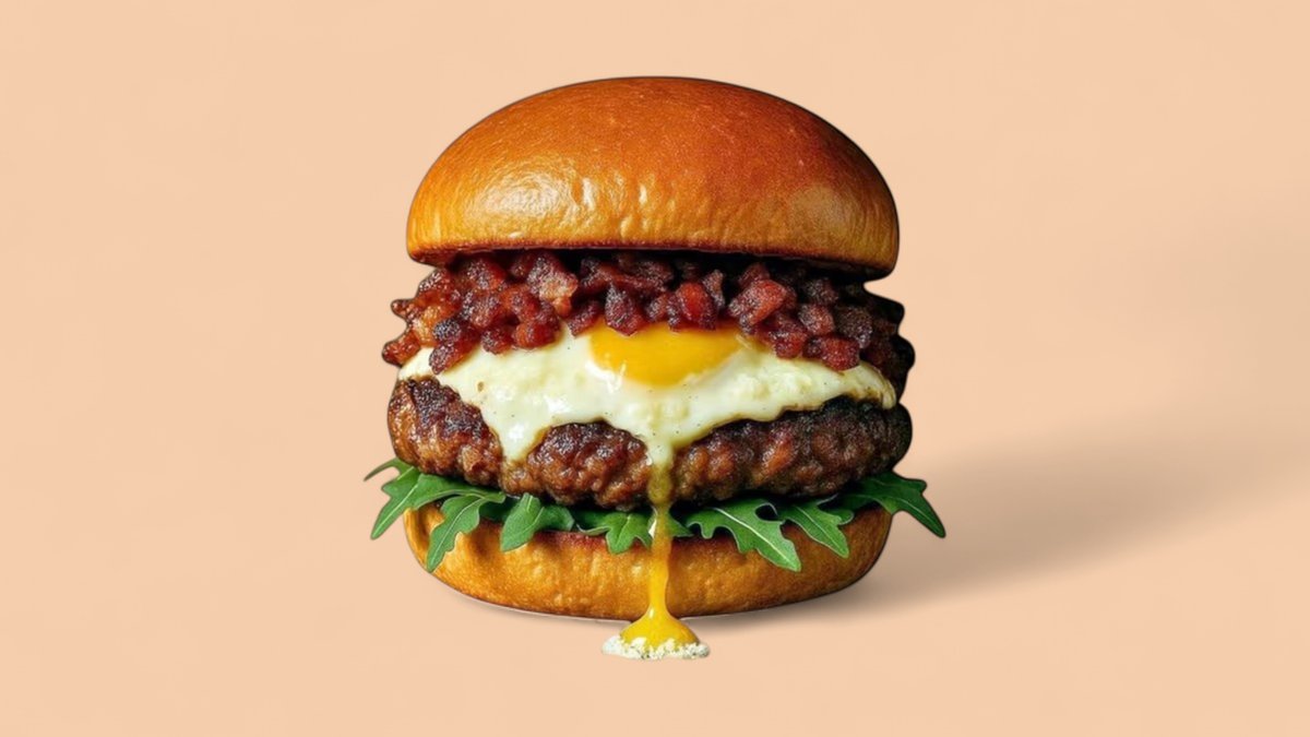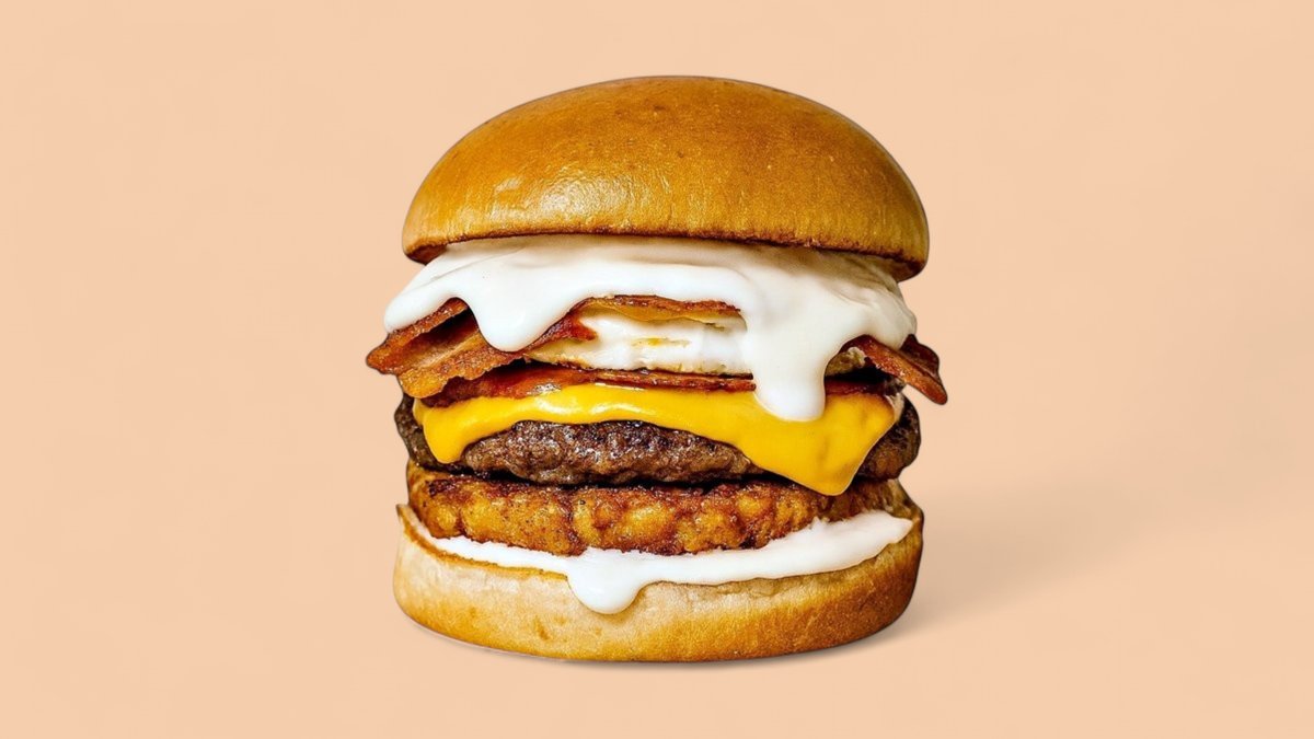Juicy beef patty layered with melted American cheese, crispy bacon, golden hash brown and a perfectly fried egg, finished with creamy mayo. Comforting, bold and breakfast-inspired. Served with fries.