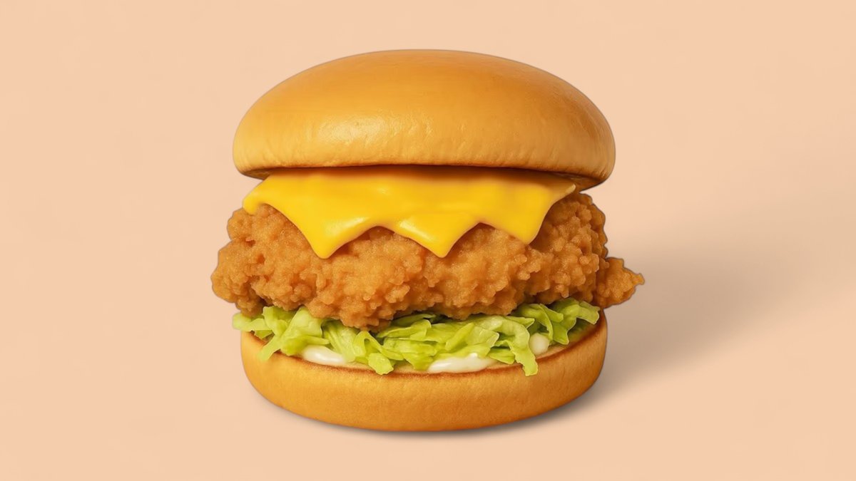 Crispy buttermilk chicken breast layered with double American cheese, fresh lettuce and smooth mayo, all served in a soft brioche bun. Golden, creamy and perfectly balanced. Served with fries.