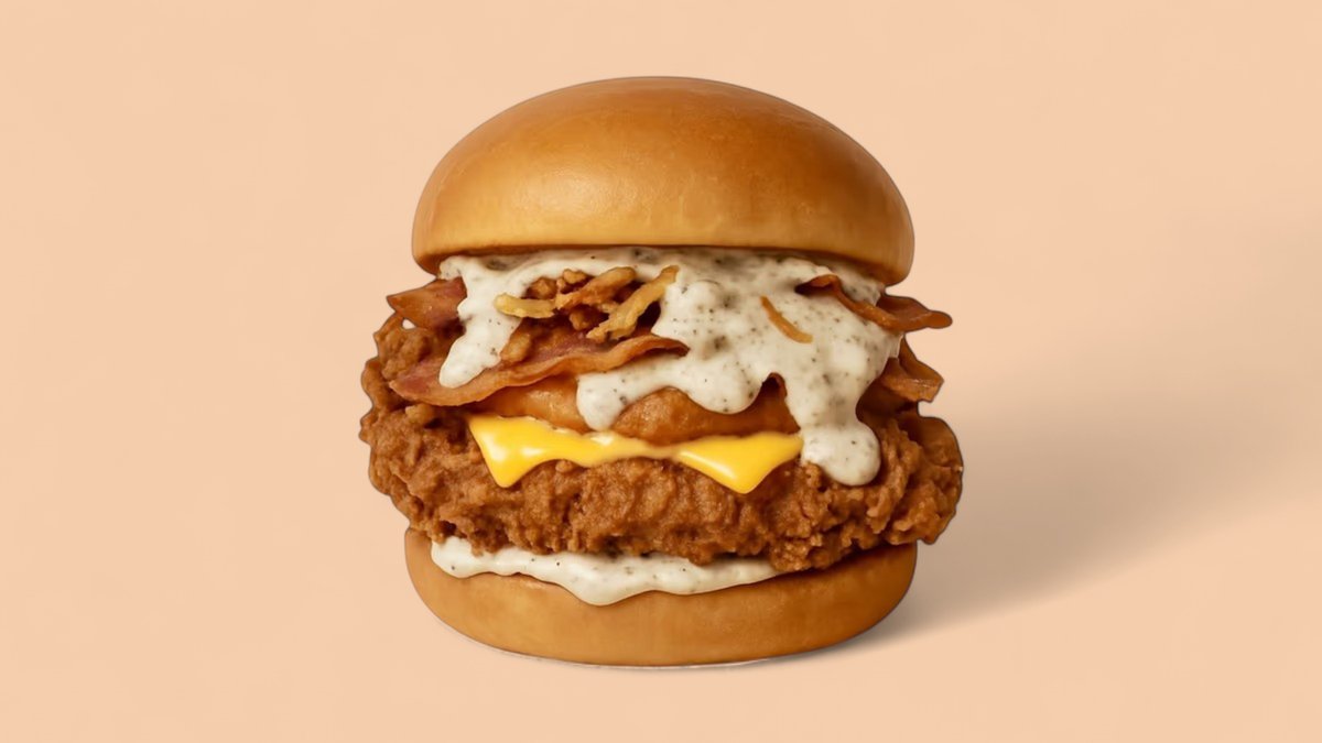 Golden fried buttermilk-chicken breast layered with double American cheese, crispy bacon, golden fried onions and a rich drizzle of truffle sauce, all served in a soft brioche bun. Served with fries.