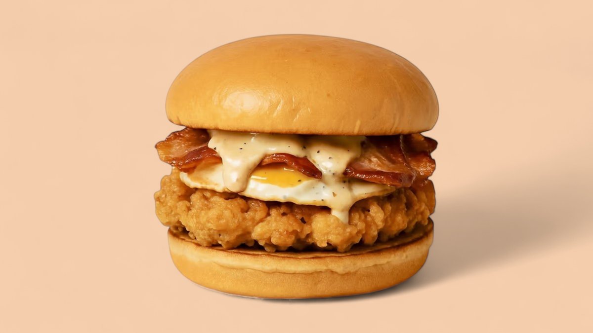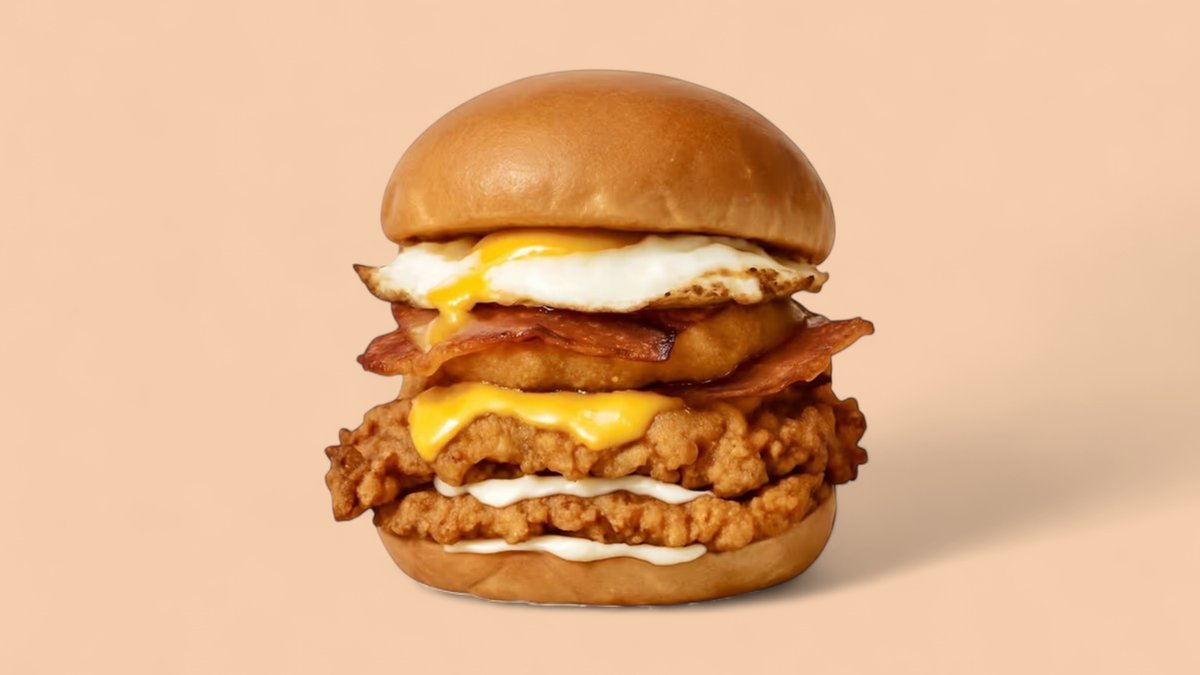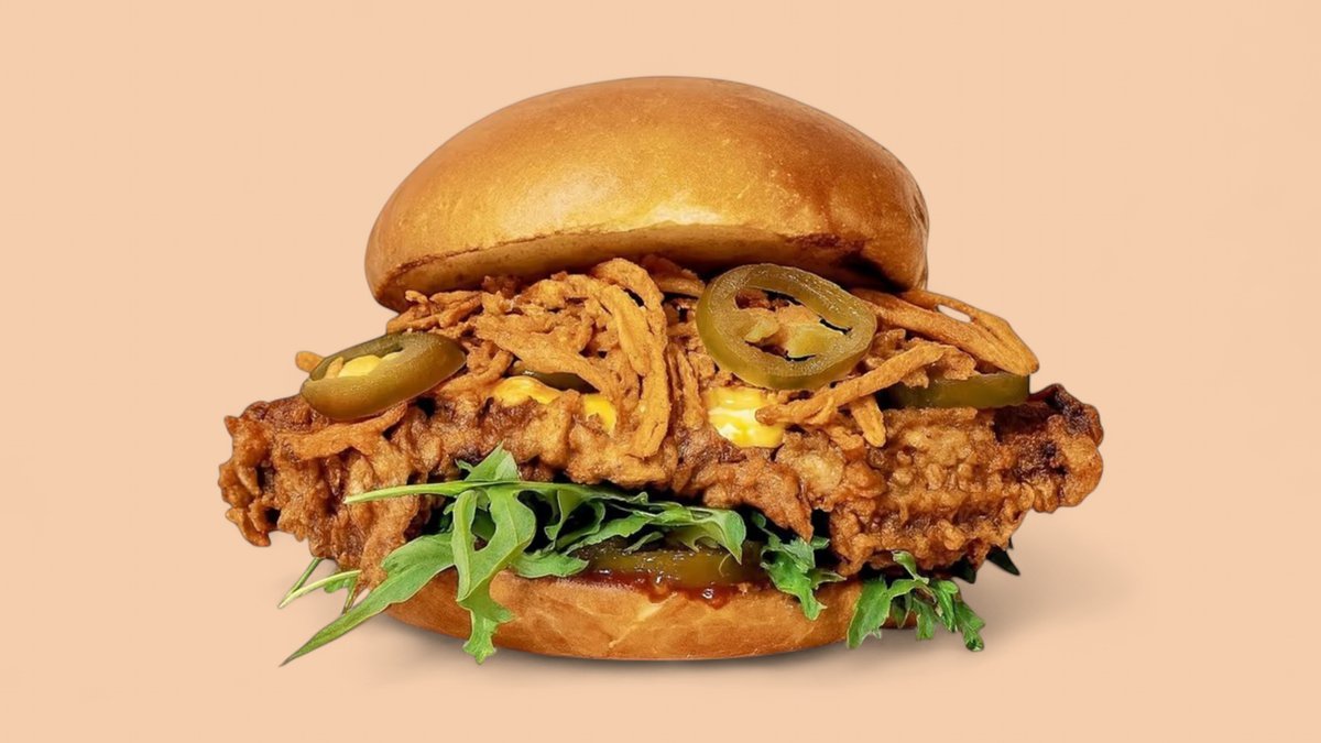 Golden fried chicken breast layered with melted American cheese, a crispy hash brown, streaky bacon, a freshly fried egg and smooth mayo, all served in a soft brioche bun. Served with fries.