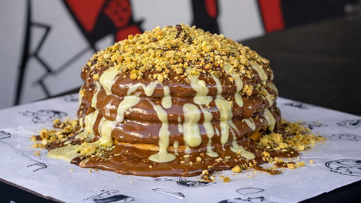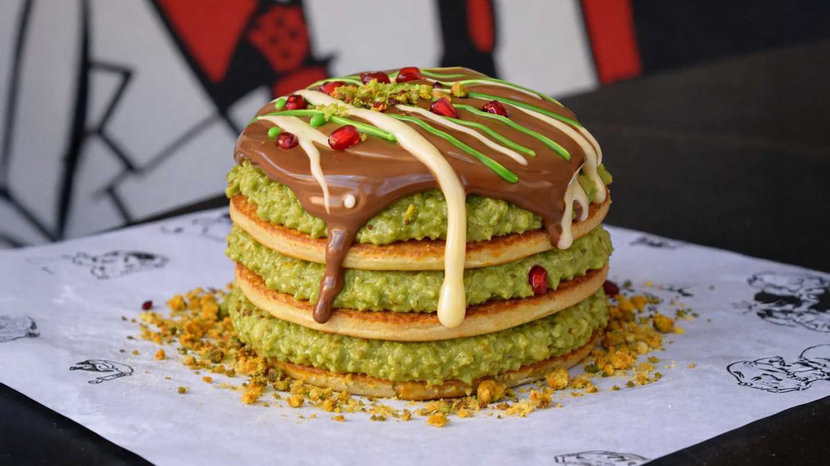 Fluffy pancakes stacked and loaded with rich pistachio cream, silky milk chocolate, white chocolate drizzle and finished with crunchy toppings. Inspired by the famous Dubai dessert trend and made to seriously indulge.